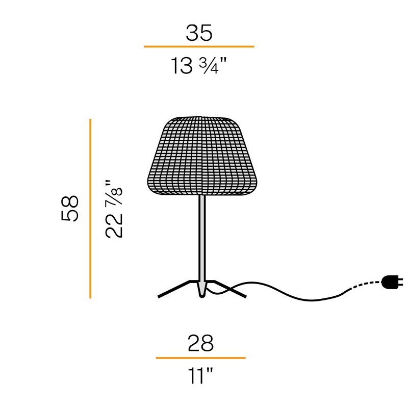 Уличные светильники в подвесной, настольной и напольной версиях, а также со штыком для установки на землю. Абажур из сотканного в ручную искусственного ротанга, основание из алюминия/латуни (настольная, напольная и версия со штыком). Внутри абажура сфера из поликарбоната с лампой. Светильник со штыковым креплением, предназначен для легкого снятия на зиму. Подвесная версия поставляется с оранжевым кабелем питания (версия диаметром 90 см также оснащена стальным тросом). Доступны аксессуары для крепления к стене. Идеально подходит для открытых площадок, террас или освещения сада.