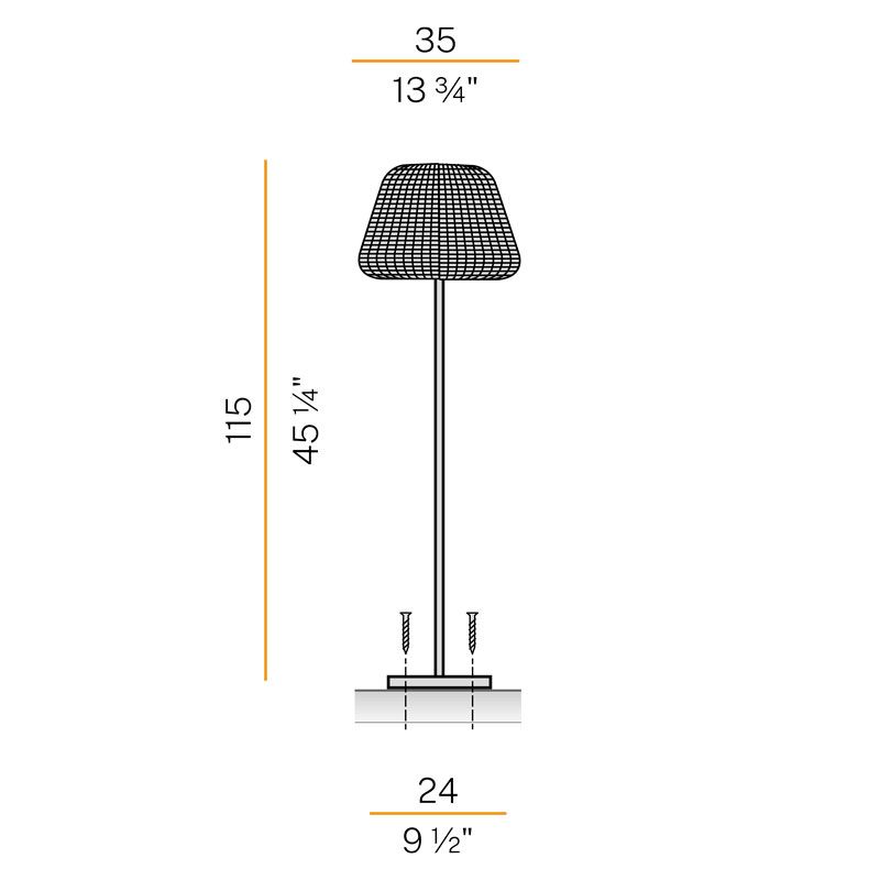 Уличные светильники в подвесной, настольной и напольной версиях, а также со штыком для установки на землю. Абажур из сотканного в ручную искусственного ротанга, основание из алюминия/латуни (настольная, напольная и версия со штыком). Внутри абажура сфера из поликарбоната с лампой. Светильник со штыковым креплением, предназначен для легкого снятия на зиму. Подвесная версия поставляется с оранжевым кабелем питания (версия диаметром 90 см также оснащена стальным тросом). Доступны аксессуары для крепления к стене. Идеально подходит для открытых площадок, террас или освещения сада.