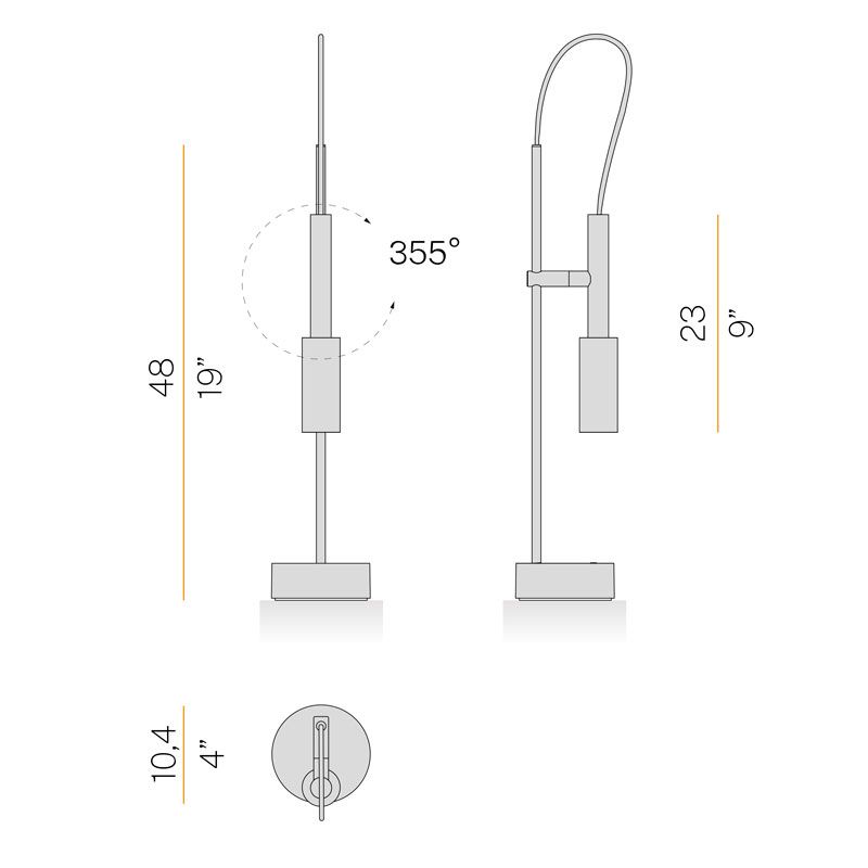 Светильники выполнены из алюминия с двухпозиционным зажиганием и прозрачным кабелем. Настенную и потолочную версии Tubino можно легко прикрепить к изголовью кровати, как в жилых, так и в гостиничных проектах. В напольной версии источники освещения двойные, расположение на стержневой конструкции позволяет использовать ее также в качестве лампы для чтения. Настольная версия также доступна как и Tubino Plus с регулятором Step DIM и 5 настройками интенсивности света.