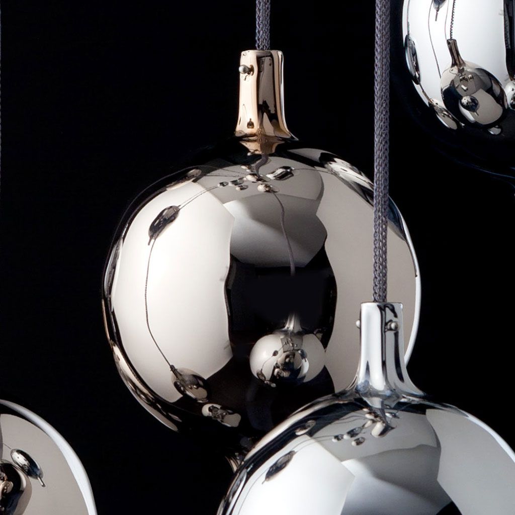 Формы из выдувного стекла, прозрачные или матовые, подвешенные к металлическим сетчатым трубчатым сеткам, отражают свет в комнате, создавая наводящие на размышления сцены.