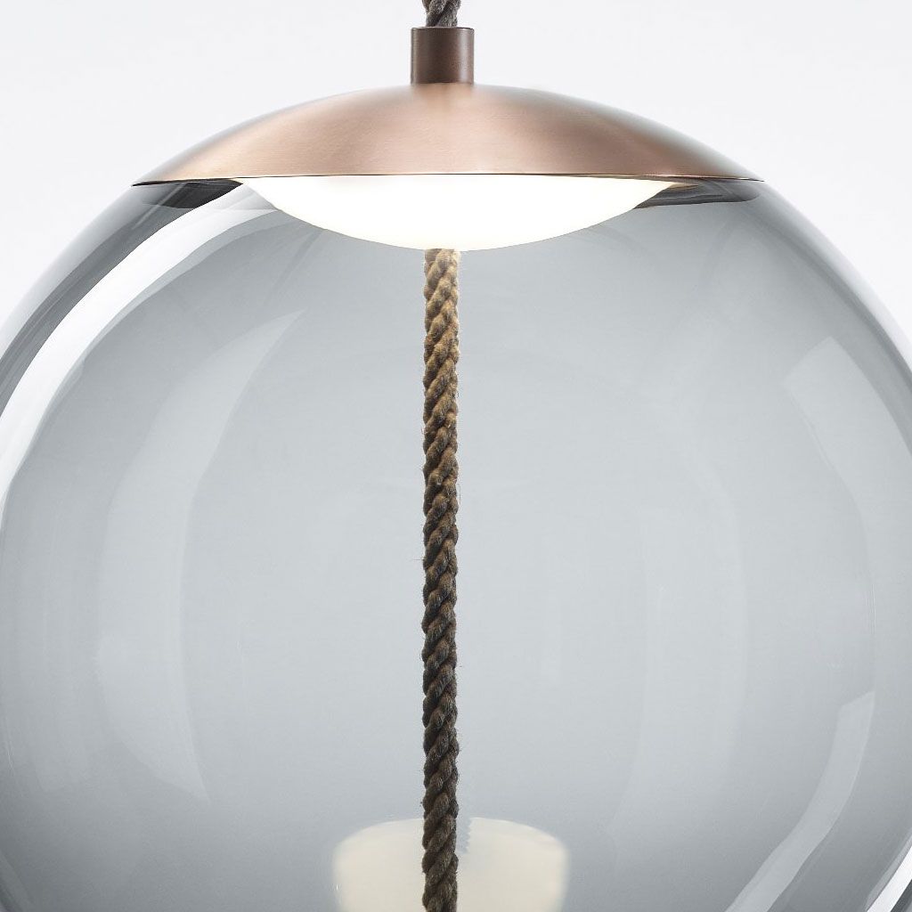 Полноразмерные шары разных форм и размеров пронизаны прочной веревкой, которая заканчивается в основном элементе дизайна коллекции – узле, который словно втягивает дно стекла внутрь, создавая завораживающий пластиковый эффект. Светодиодный источник света расположен под элегантным колпаком из штампованного металла и защищен снизу выдувным вручную опаловым рассеивателем. Другой металлический элемент служит для закрытия конца веревки. Светильники Knot прекрасно подходят как для частных, так и для общественных помещений и особенно эффектно смотрятся над обеденными столами.