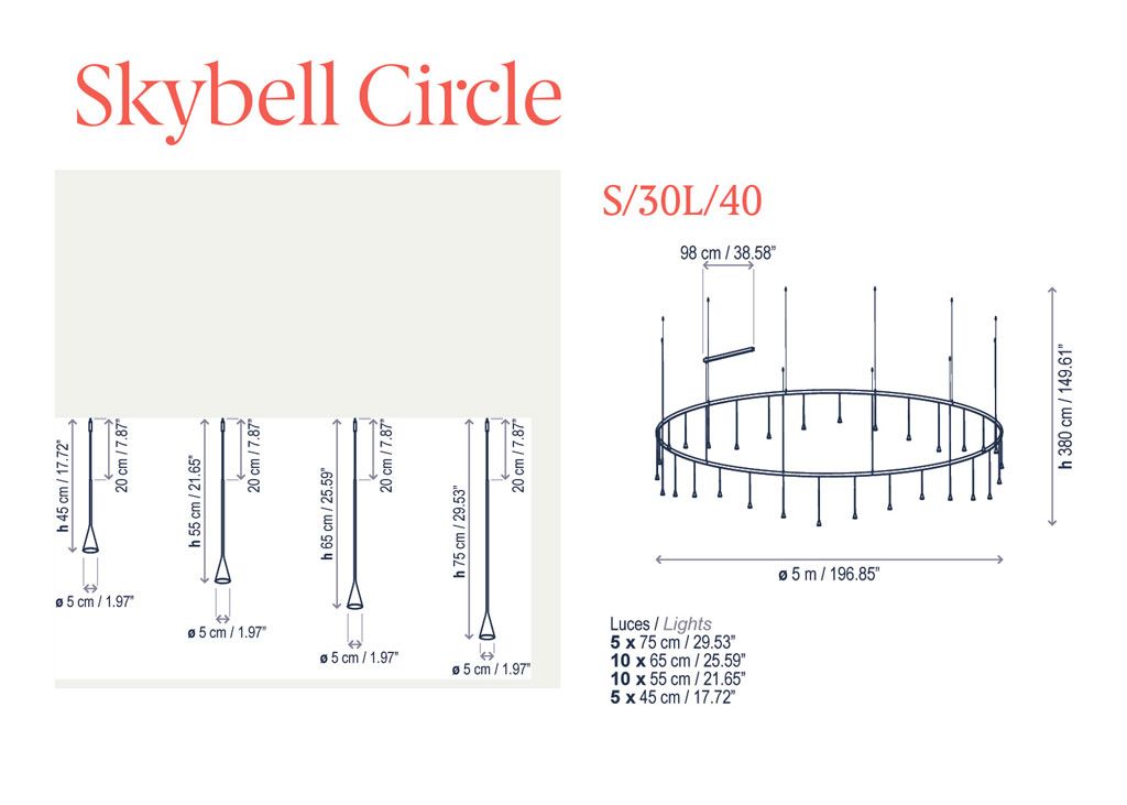 Skybell — это обширная система световых конструкций, разработанная для адаптации к любому типу применения. Их главная характеристика — это создаваемый ими образ: они ненавязчивы и жизнерадостны. Они дарят ощущение фантазии и свободы в своих применениях, поскольку их можно комбинировать в различных вариантах, смешивая 4 размера, чтобы создать более индивидуальную и динамичную концепцию светильника, или же сохранять все «колокола» одинаковой длины, создавая более традиционный образ. В зависимости от предпочтений пользователя, положение «колоколов» можно легко изменить с помощью разъема (джека), который позволяет подключать их к сети одним щелчком. Эта функция подходит для всей коллекции Skybell.