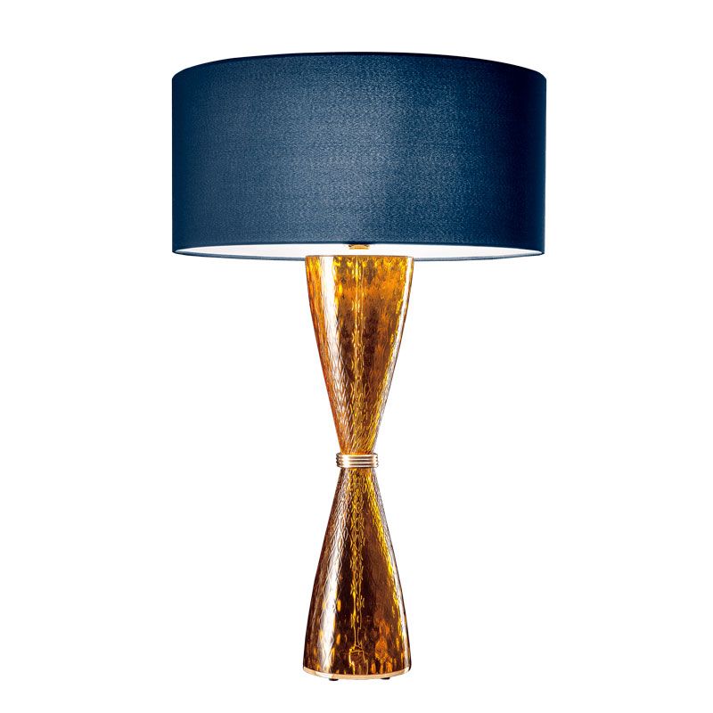 Корпус выполнен из декоративного стекла и представлен в нескольких цветах, гармонично сочетающихся с оттенком абажура. Тканевый абажур из ponge мягко рассеивает свет, создавая комфортную и уютную атмосферу.
