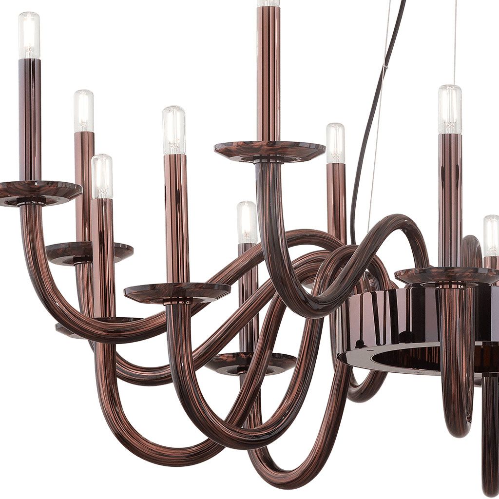 От кольцевого основания расходятся изящно изогнутые стеклянные трубки, завершающиеся световыми элементами, напоминающими свечи. Дисковидные детали выполняют роль современных подсвечников, усиливая ассоциацию с классическим канделябром.