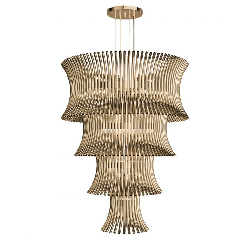 Современный световой потолок Flusso связывает танец с освещением, формируя эффектный и экстравагантный дизайн освещения. Все позолоченные латунные трубки формируются и собираются вручную.