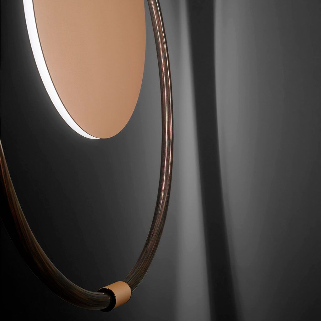Кольцевая форма выполнена из чёрного художественного стекла с пигментом avventurina, создающим тонкое мерцание и глубину поверхности. Внутренний металлический диск с матовой отделкой шампань или матовая бронза формирует мягкое отражённое свечение и усиливает визуальный контраст.