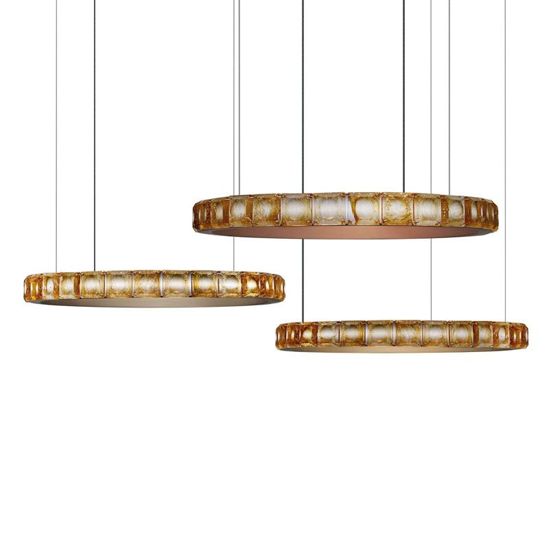 Подвесной светильник Aura сочетает лаконичную форму и благородство материалов. Металлическое кольцо доступно в отделках сатинированное серебро, сатинированное золото и сатинированная бронза. Композицию дополняют квадратные прозрачные рассеиватели из стекла Krek, создающие выразительную игру света.