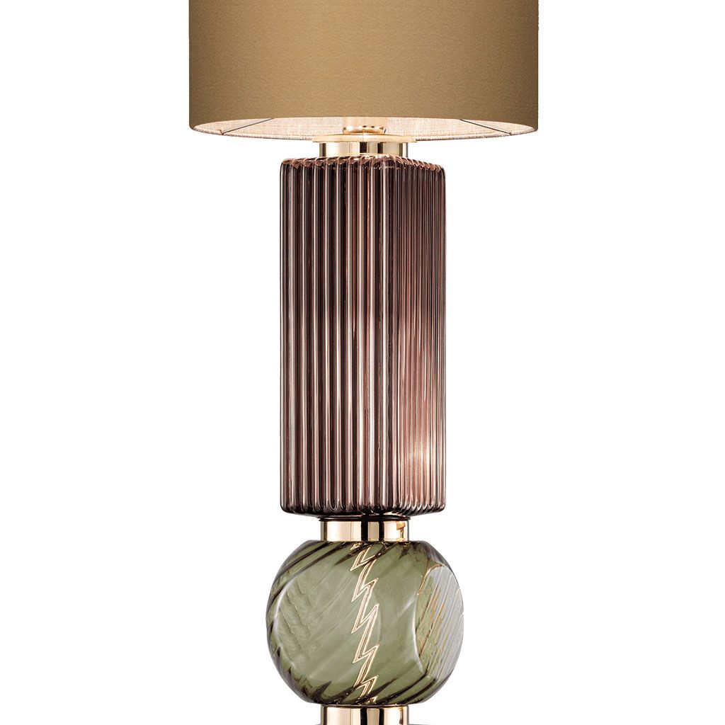 Основание светильника построено на сочетании декоративных элементов из выдувного стекла с рельефной фактурой и центрального акцентного элемента из цветного стекла, создающего глубину и игру отражений. Металлические детали в отделке light gold добавляют композиции утончённый блеск и завершённость.