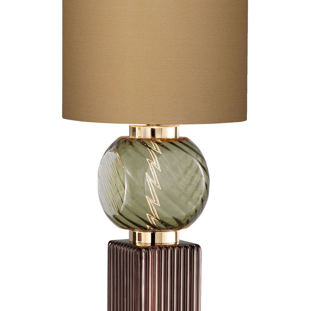 Основание светильника построено на сочетании декоративных элементов из выдувного стекла с рельефной фактурой и центрального акцентного элемента из цветного стекла, создающего глубину и игру отражений. Металлические детали в отделке light gold добавляют композиции утончённый блеск и завершённость.