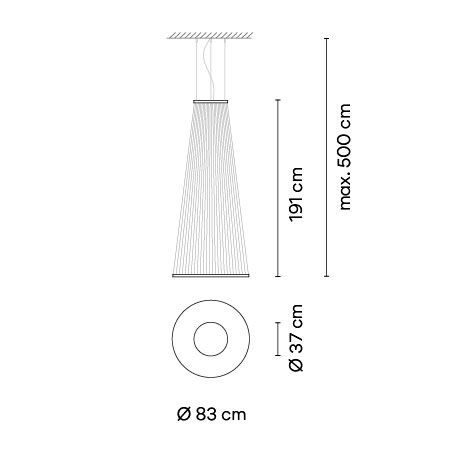 Состоящий из множества тонких технических нитей, туго натянутых между двумя алюминиевыми кольцами, Array представляет широкий спектр конических и цилиндрических силуэтов, которые можно комбинировать вместе, образуя привлекательную инсталляцию. Равномерное распределение нитей создает прозрачность и объем, в то время как эффект наслоения создает иллюзию движения. Подвешенный над головой массив излучает приятный нисходящий свет, исходящий от невидимого источника, скрытого внутри нижнего кольца. В то же время непрямой свет устремляется вверх в виде градиента цвета, скорее обволакивая, чем вторгаясь в пространство, которое он занимает.