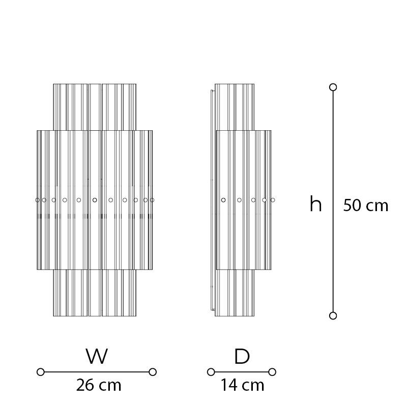 Конструкция выполнена из металла с хромированной отделкой и дополнена четырёхугольными элементами из муранского стекла прозрачного, дымчатого или тикового цвета, которые эффектно фильтруют свет, исходящий от источника, расположенного по периметру.
