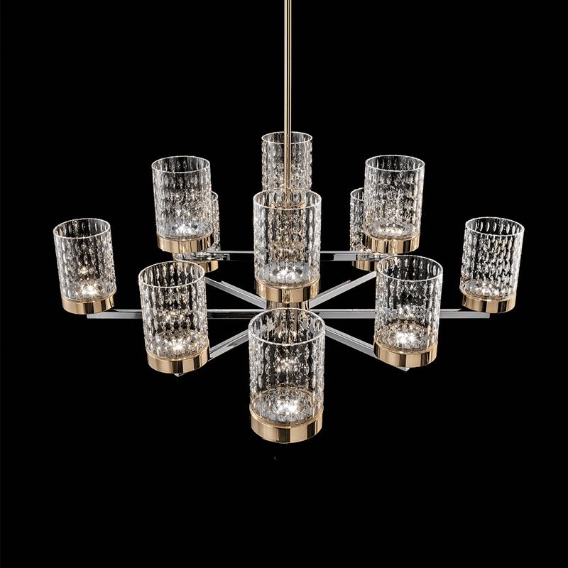 Композиция строится на чётких металлических линиях, к которым крепятся цилиндрические плафоны из резного стекла. Их поверхность украшена ритмичным фактурным узором, благодаря которому свет мягко преломляется и создаёт многослойное сияние.