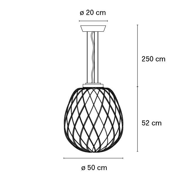 Подвесной светильник, обеспечивающий рассеянный свет с регулируемой яркостью. Рассеиватель из выдувного опалового стекла, обработанного кислотой, или прозрачного стекла. Оцинкованный металлический каркас и основание. Стальные подвесные тросы. Прозрачный силовой кабель.