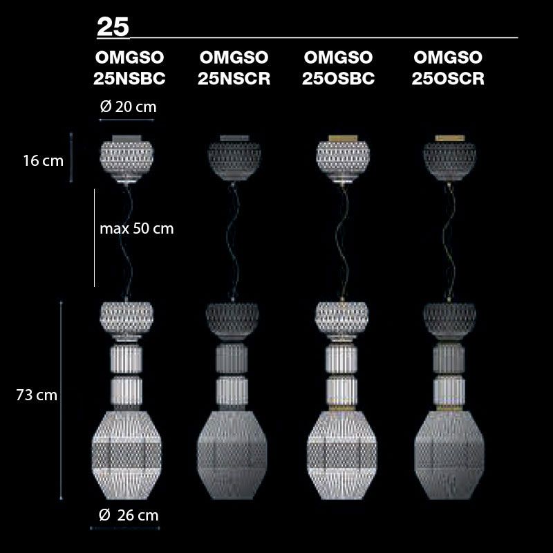 Коллекция OMG, аббревиатура от Oh My Glass! - это дань красоте формованного стекла. Разнообразие форм, размеров и отделки для создания «симфонии» подвесов и потолочных светильников. Вариации цвета стекла, отделки рамы и форм делают возможными различные комбинации. Стекло доступно прозрачное или белое. Структура и потолочное крепление: матовый никель или золото.