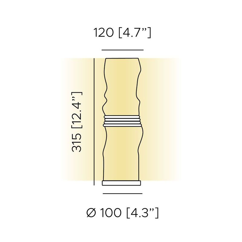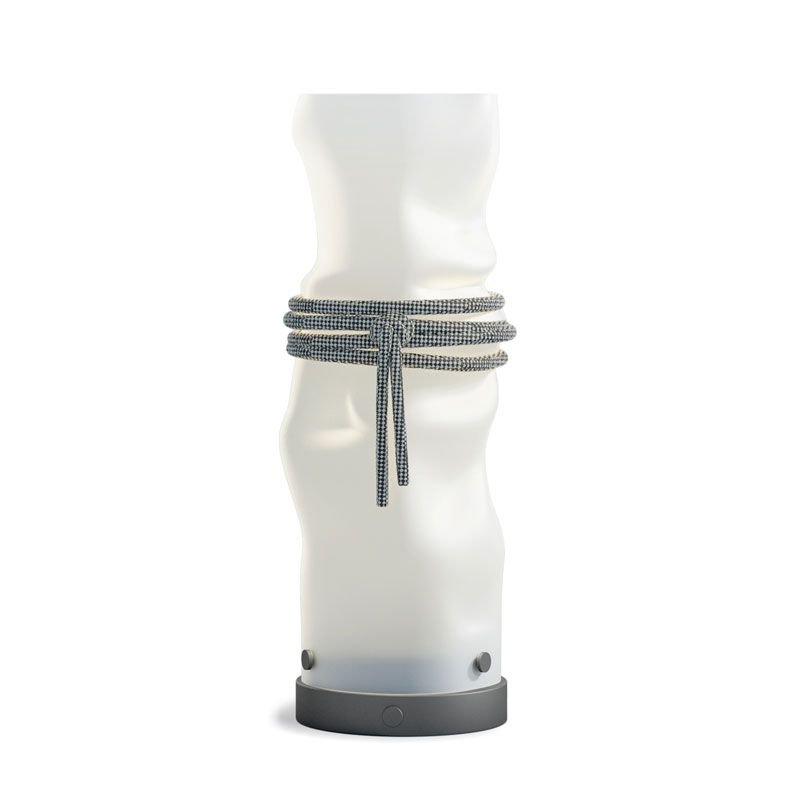 Рссеиватели выполнены из двойного сатинового поликарбоната разной высоты, которые имеют неправильный вид смятых бумажных трубочек, а потолочная розетка выполнена в матово-белом лаковом покрытии. Отличительный мягкий текстильный шнур белого/серого цвета - деталь, выражающая архидекоративный стилистический код бренда, становится соединительным элементом для настольного и напольного вариантов и поддерживает лампу в подвесном варианте.