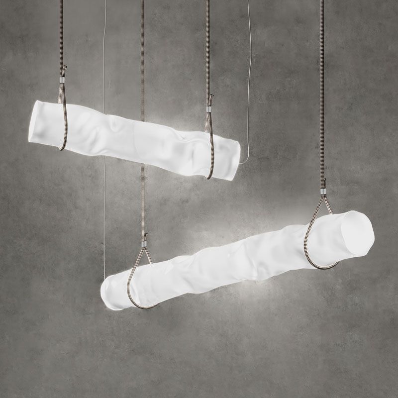 Рссеиватели выполнены из двойного сатинового поликарбоната разной высоты, которые имеют неправильный вид смятых бумажных трубочек, а потолочная розетка выполнена в матово-белом лаковом покрытии. Отличительный мягкий текстильный шнур белого/серого цвета - деталь, выражающая архидекоративный стилистический код бренда, становится соединительным элементом для настольного и напольного вариантов и поддерживает лампу в подвесном варианте.