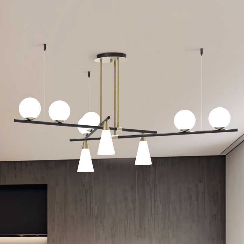 В коллекции Mikado сферы и конусы сочетаются в металлической раме, окрашенной в черный цвет, с деталями из матовой латуни. Элегантный дизайн, дополненный матовым стеклом различной формы, делает уникальным не только само изделие, но и помещение, в котором оно установлено.