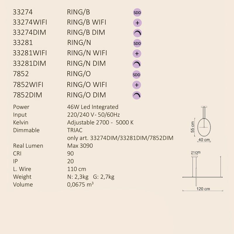 Коллекция Ring – это сочетание геометрических форм, которое оживляет эту коллекцию. Ring – это строгий и практичный, но в то же время шикарный и эффектный подвесной светильник, идеально подходящий для классических и современных интерьеров, где он максимально раскрывает свою оригинальность.