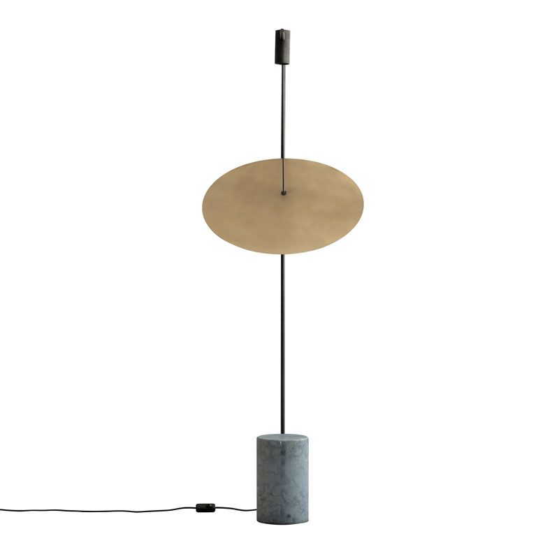 The Moon - это минималистичный торшер, созданный из геометрических форм, где каждый компонент идеально сбалансирован друг с другом. Торшер имеет два источника света, расположенных в качестве композиционных точек опоры на кронштейне из оксидированной латуни. Большой круглый абажур свисает с кронштейна в качестве плавающего отражателя в пространстве. Абажур из матовой латуни подсвечивается с обеих сторон, создавая теплое и мягкое освещение. Светильник The Moon закреплён на цилиндрическом основании из неполированного серого мрамора, стабилизирующем конструкцию.