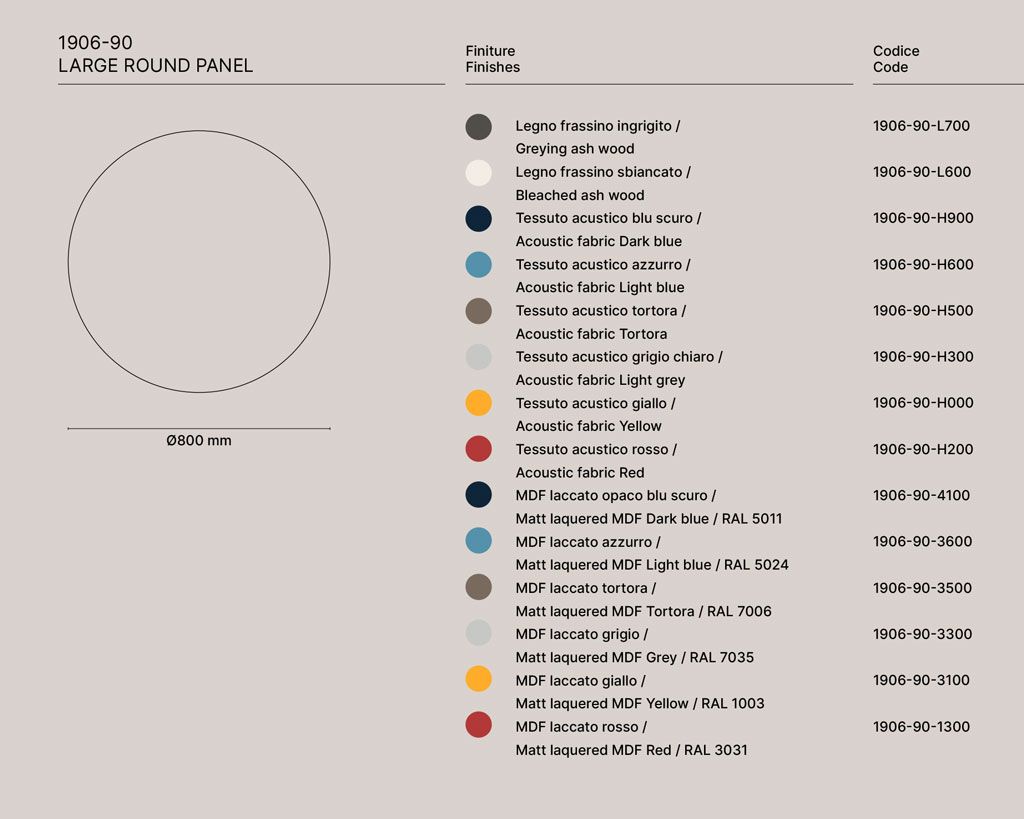Светодиодная планка с двойным излучением соединена с панелями различных форм и цветов, изготовленными из дерева, МДФ покрытыми лаком или звукопоглощающим материалом (доступно только для 1906-90 - LARGE ROUND PANEL и 1906-95 - LARGE OVAL VERTICAL PANEL).