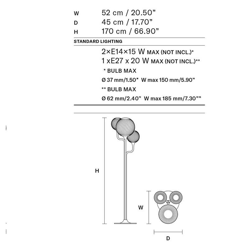 Каркас из оцинкованного металла, плафоны из муранского стекла триплекс. Tee Outdoor — это экспериментальный дизайнерский проект, в котором сочетаются строгость и элегантность, эстетически отличающийся изогнутой формой. Световые сферы для улицы оживают благодаря контурам, отражающим волнообразную природу света, соединенным органически сформированными стеблями, напоминающими изящество цветка каллы.