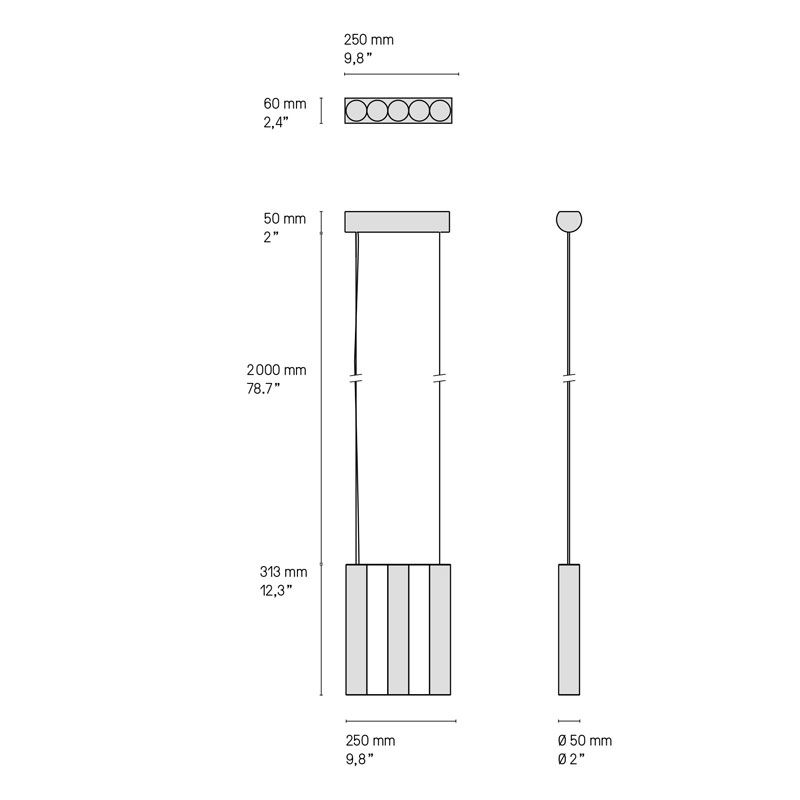 Дизайн этой коллекции основан на умножении металлических трубок и светящихся цилиндров опалово-белого цвета, собранных в цепочку.