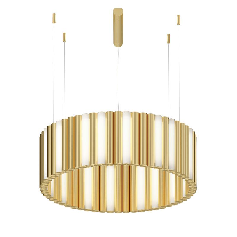 Дизайн этой коллекции основан на умножении металлических трубок и светящихся цилиндров опалово-белого цвета, собранных в цепочку.