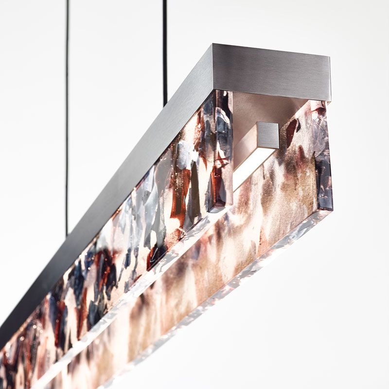 Fragment Line запечатлевает мимолетный диалог света и природы, где расплавленные осколки напоминают облака, плывущие над далеким горизонтом. В её текстурированных глубинах таится внутренняя вселенная, богатая замысловатыми деталями и скрытыми галактиками света и цвета. Её стеклянные поверхности мерцают, словно вода, постоянно меняясь с каждым взглядом. Разработанная как идеальное решение для освещения обеденных зон, рабочих столов или кухонных островов, Fragment Line воплощает минималистичную элегантность, гармонично сочетая функциональность.