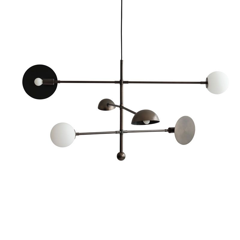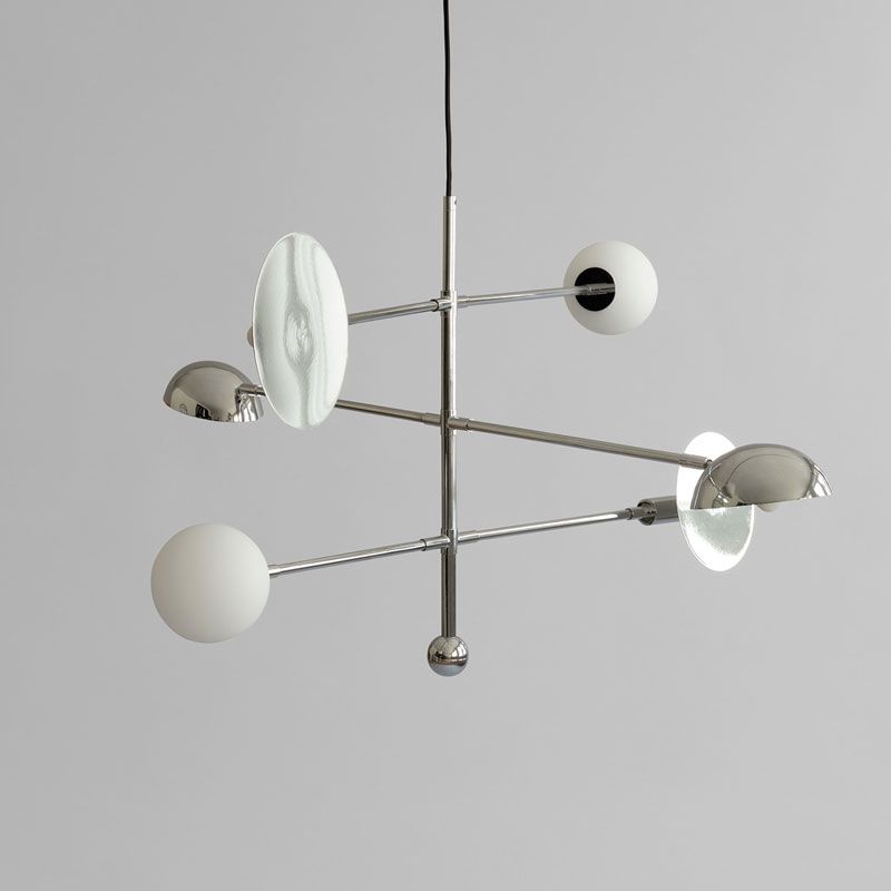 Вдохновленная футуристическим дизайном 70-х годов и космической эрой, люстра Sahn - это движение и гибкость. Каждый кронштейн лампы и абажур могут поворачиваться и крутиться в разные стороны, подчеркивая уникальное и скульптурное освещение комнаты.