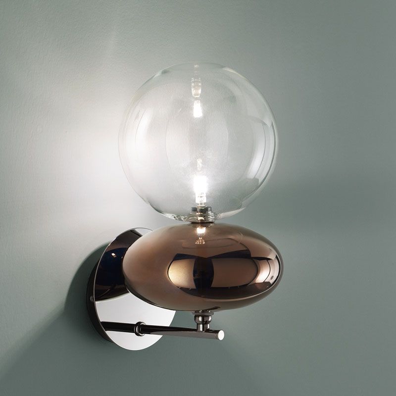 Сферическая ампула из прозрачного боросиликатного стекла и отражающий бронзовый эллиптический элемент образуют идеальный симбиоз, подчеркивая их особенности с помощью источника света.