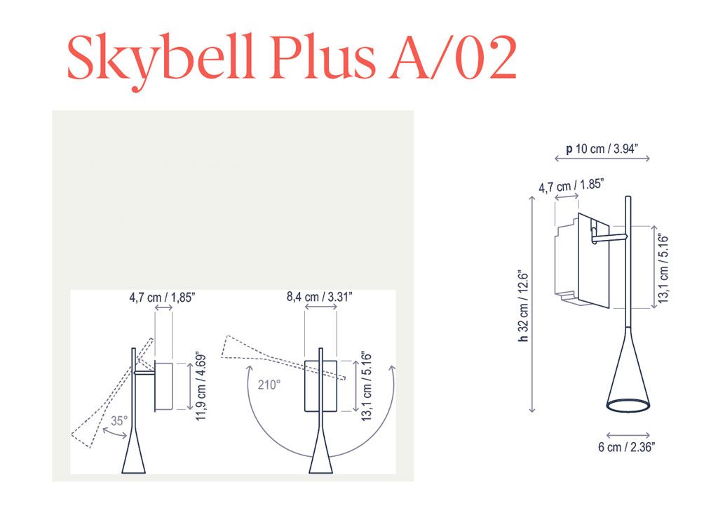 Skybell — это обширная система световых конструкций, разработанная для адаптации к любому типу применения. Их главная характеристика — это создаваемый ими образ: они ненавязчивы и жизнерадостны. Они дарят ощущение фантазии и свободы в своих применениях, поскольку их можно комбинировать в различных вариантах, смешивая 4 размера, чтобы создать более индивидуальную и динамичную концепцию светильника, или же сохранять все «колокола» одинаковой длины, создавая более традиционный образ. В зависимости от предпочтений пользователя, положение «колоколов» можно легко изменить с помощью разъема (джека), который позволяет подключать их к сети одним щелчком. Эта функция подходит для всей коллекции Skybell.