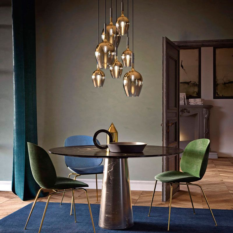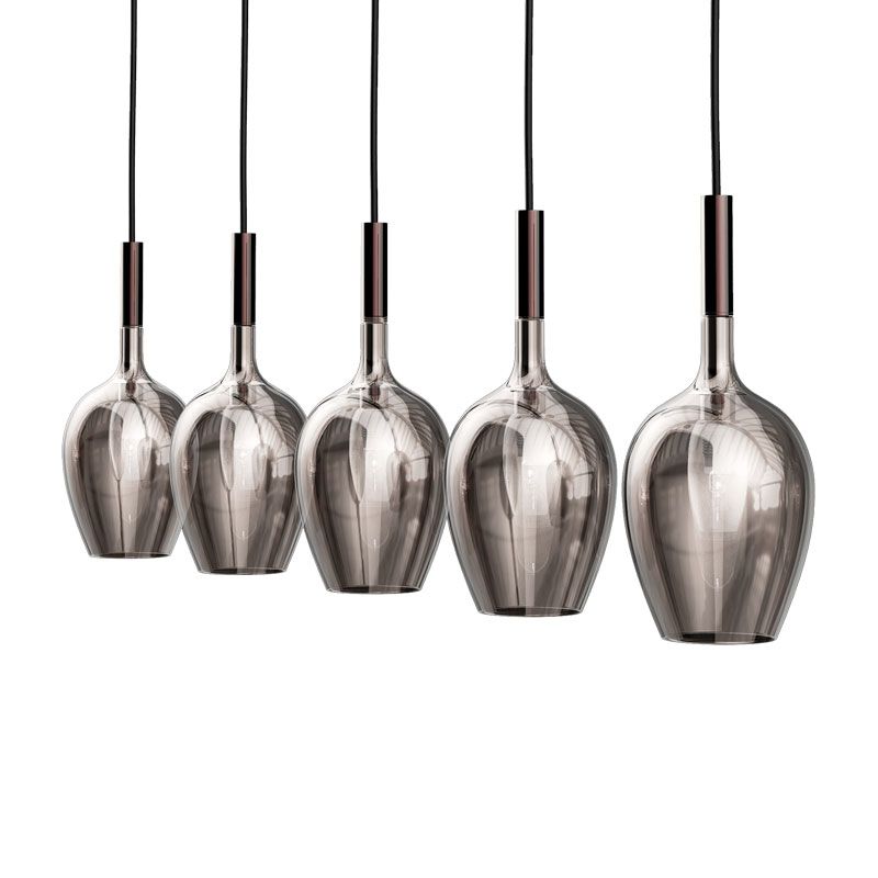 Плавные формы выдувного стекла подчёркнуты зеркально-металлической отделкой, создающей глубокие отражения и эффектное свечение. Рассеиватели представлены в различных оттенках — от розового золота и золотистого до титанового и прозрачно-глянцевого, позволяя точно интегрировать светильник в интерьер.