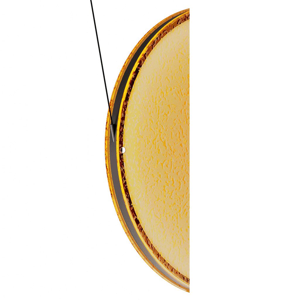 Мягко изогнутый рассеиватель из художественного стекла в тёплых янтарных или глубоких коричневых оттенках словно улавливает движение света, создавая атмосферу уюта и глубины. Контраст с глянцевой тёмно-серой металлической рамой придаёт композиции графичность и современный характер.