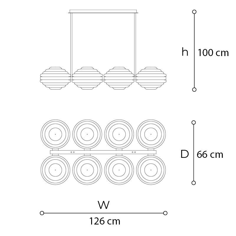 Центральный элемент — геометрическая композиция из металла, где квадратные основания и широкие стойки поддерживают круглые плафоны из матового выдувного стекла. Металлический каркас доступен в бронзе, создающей разное настроение — от тёплого, драгоценного до холодного, графичного.