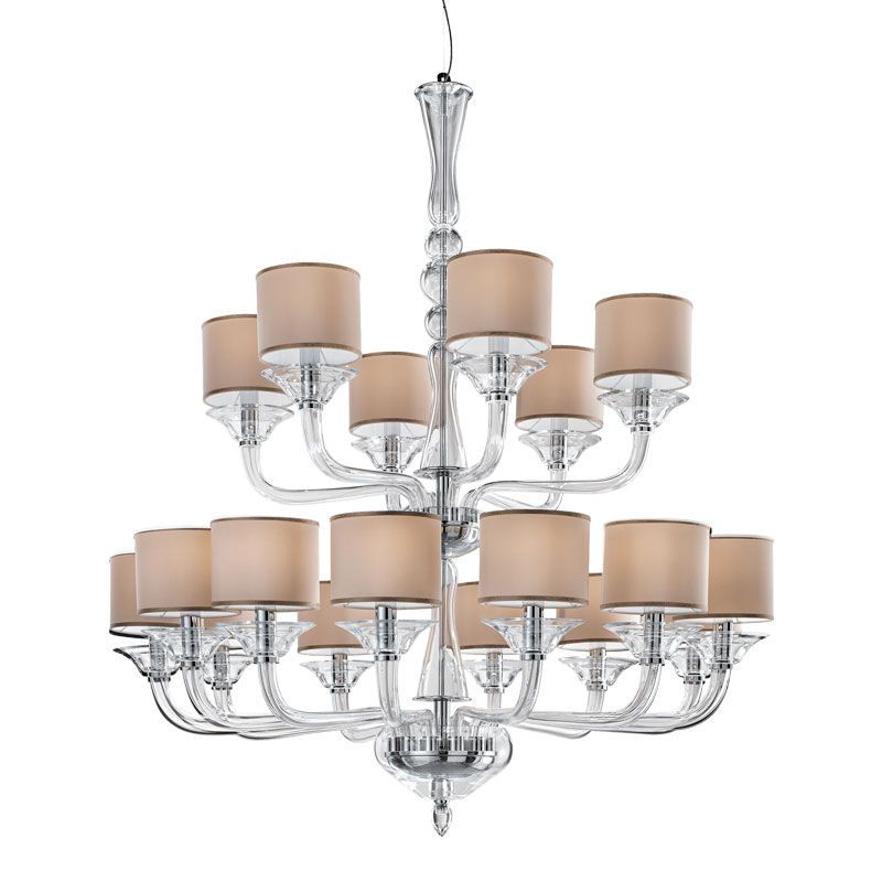 Центральный элемент — плафоны из резного хрусталя, обрамлённые металлическим каркасом в хромированной отделке. Хрустальные элементы преломляют свет, создавая сложную игру бликов и теней, а тканевые абажуры нежного бежевого или слоновой кости оттенка мягко рассеивают свечение, делая его камерным и уютным.