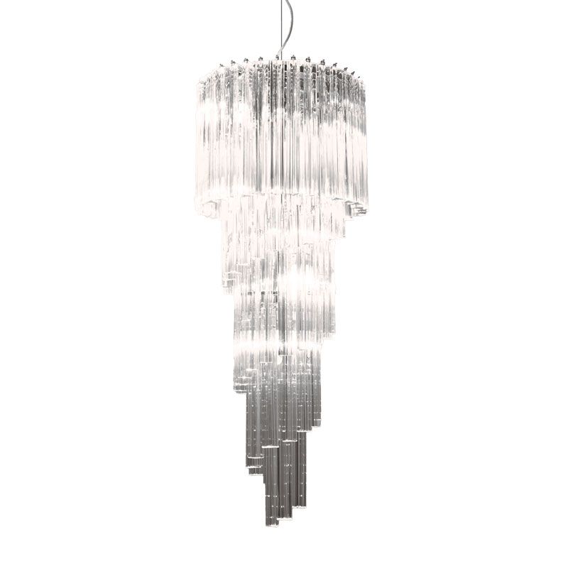 Центральный элемент — завораживающая спираль, собранная из стеклянных триэдров (треугольных призм), которые словно обвивают вертикальную ось светильника. Каждый стеклянный элемент, выдуваемый вручную на муранских мануфактурах, преломляет свет, создавая сложную игру граней и бликов. Прозрачное стекло в сочетании с металлическим каркасом в хромированной отделке рождает ощущение лёгкости и воздушности, несмотря на внушительный масштаб люстры.