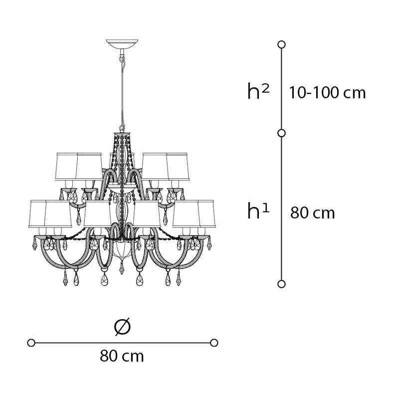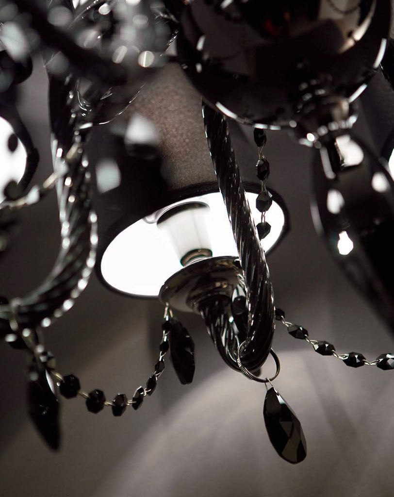 Тканевые абажуры доступны в двух цветах: белый и чёрный. Они мягко рассеивают свет, делая его камерным и уютным, и создают выразительный контраст с прозрачным или цветным хрусталём. Металлический каркас выполнен в двух благородных отделках: хром — для холодной, графичной элегантности, и серое железо — более сдержанный, насыщенный оттенок с благородным металлическим блеском.