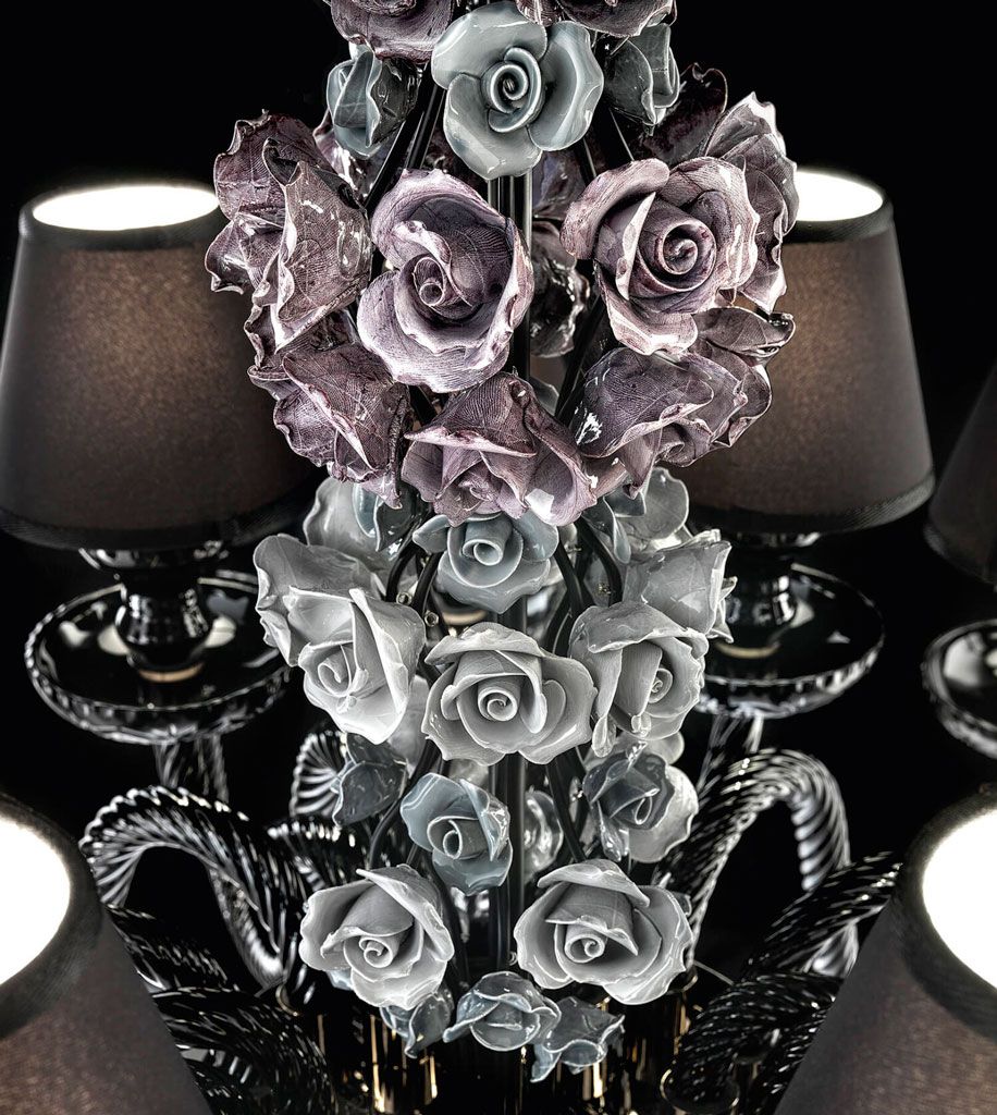 Rosemarie — это свет, который цветёт. Резной хрусталь, керамические розы, расписанные вручную, сияющий металл и мягкая ткань сплетаются в коллекцию, которая не просто освещает пространство, а наполняет его атмосферой романтики, нежности и итальянского мастерства. Люстра, похожая на роскошный букет, застывший в вечном цветении.