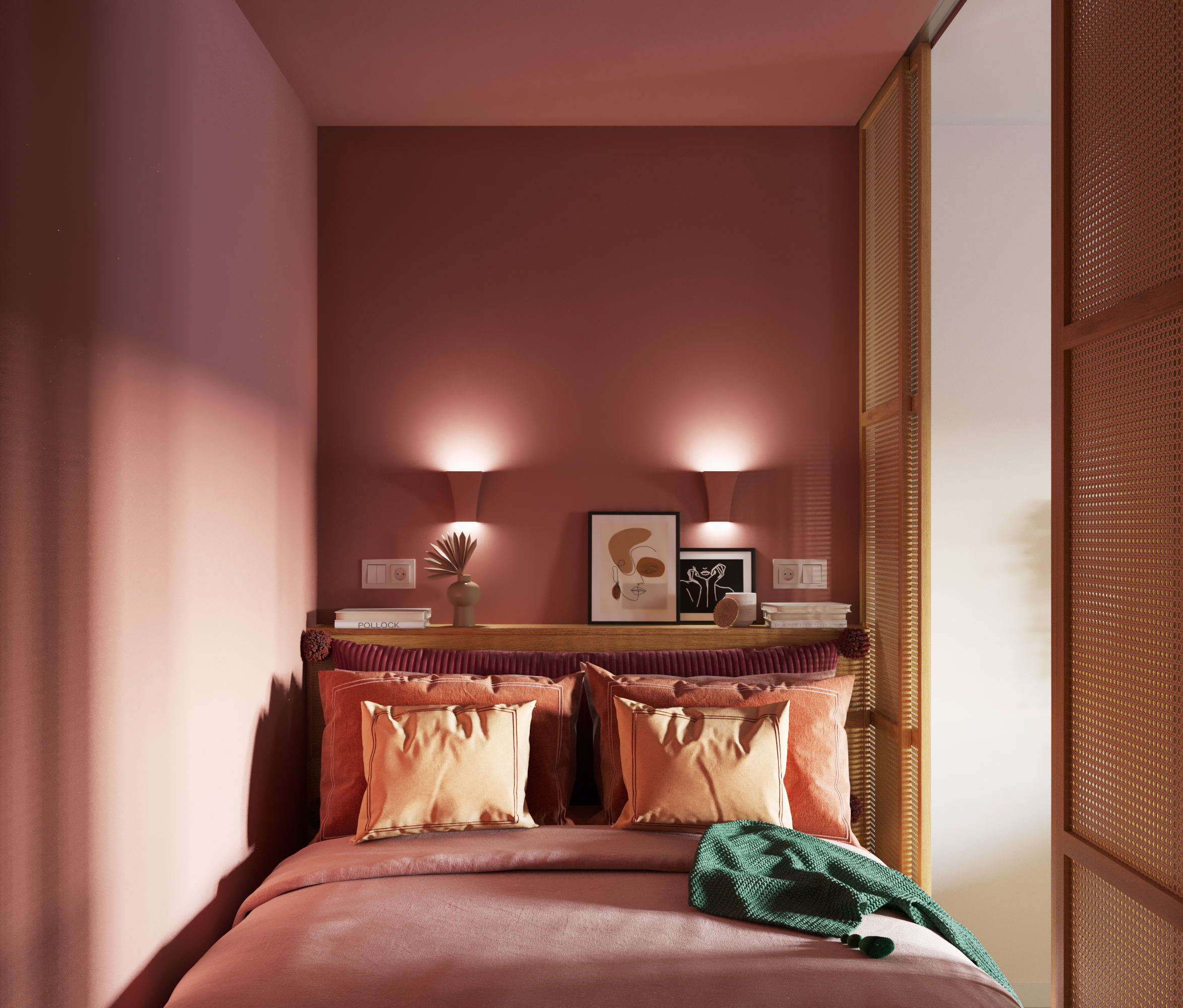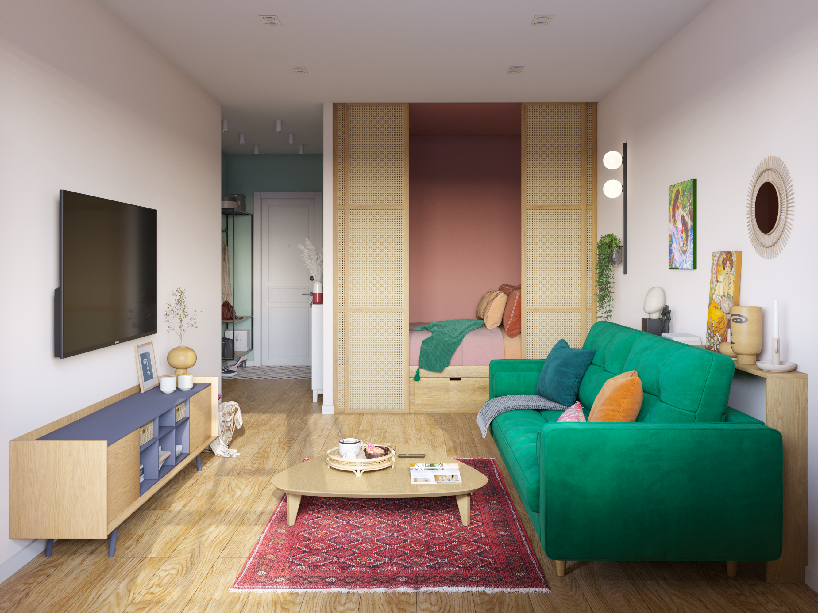 Дизайн-проект однокомнатной квартиры в Москве в доме серии II-67 для молодой девушки. Квартира в скадинавском бохо стиле. В интерьере использована пастельная природная гамма, а также много ярких акцентов. Несмотря на небольшую площадь, в квартире много мест для хранения: гардеробная комната, выдвижные ящики под кроватью, шкаф в прихожей в нише. Не забыли и о питомце. Для кошки были предусмотрены лоток, интегрированный в тумбу в ванной, миски с кормом и водой в кухонном модуле, домик-когтеточка в гостиной.