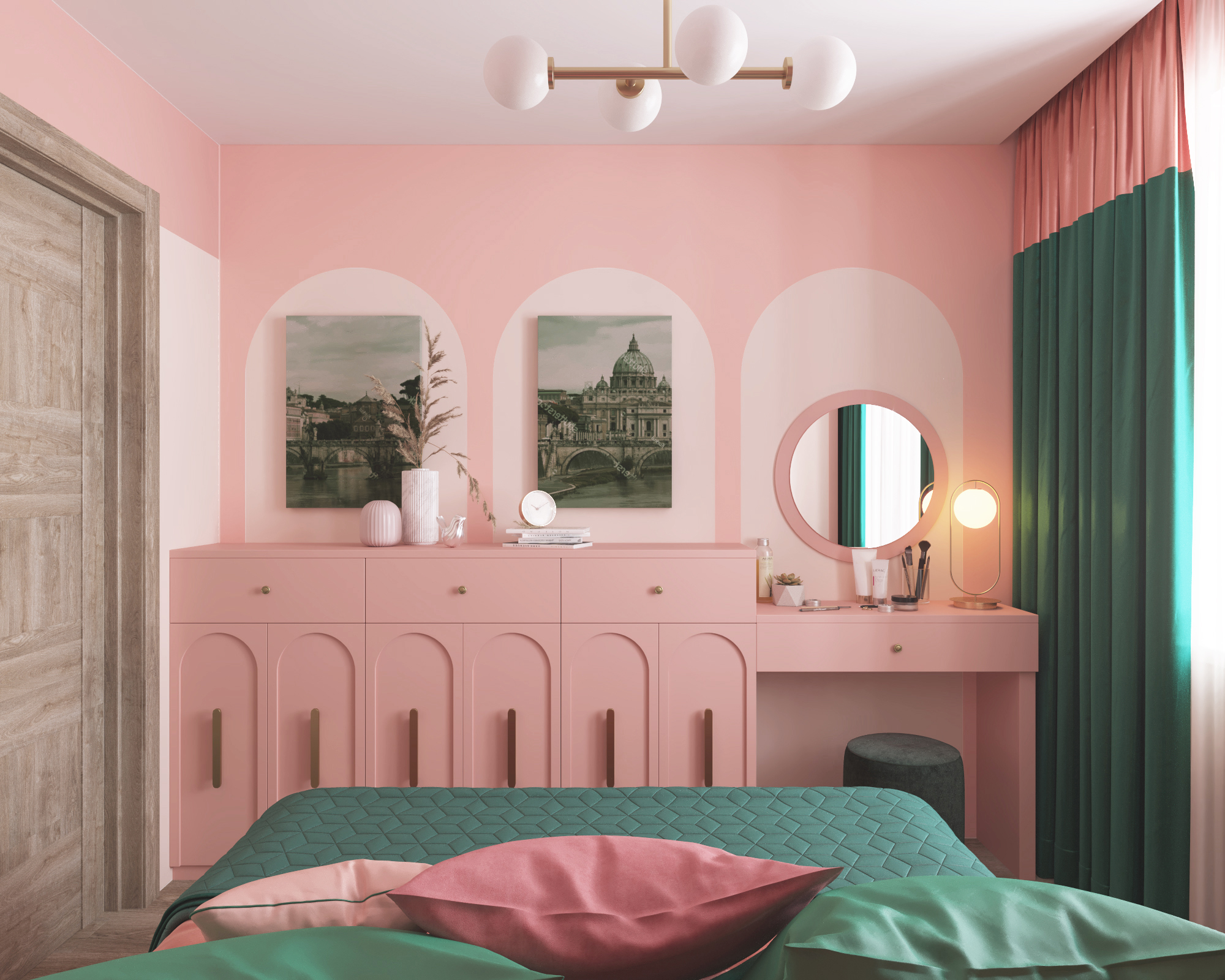 Проект был создан для семьи, где 2 мальчика-подростка, которым уже не нужна двухуровневая кровать, а вот 2 рабочих места обязательно и еще места хранения одежды, учебников и костюмов для танцев. Мальчики, оба занимаются бальными танцами. Комната маленькая, но нам удалось учесть все пожелания и разместить все необходимое. Хозяйка любит зеленый цвет, интерьер в эко стиле категорически отвергла. Она любит города, тем более что она с детьми и по своей работе часто бывает в разных городах, поэтому идея интерьера в каждом помещении свой город.