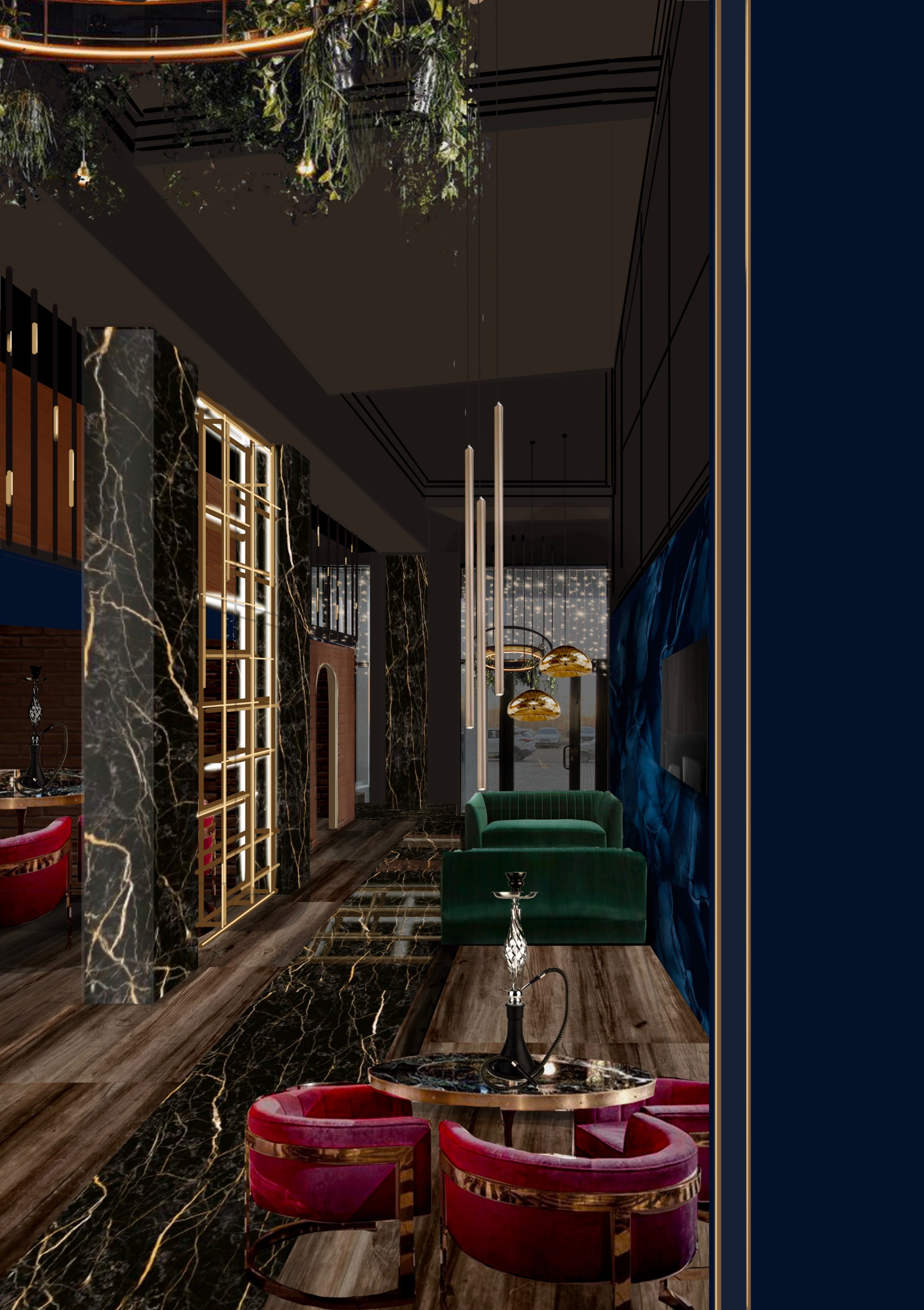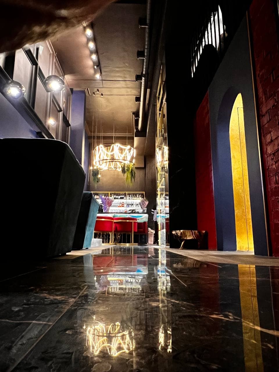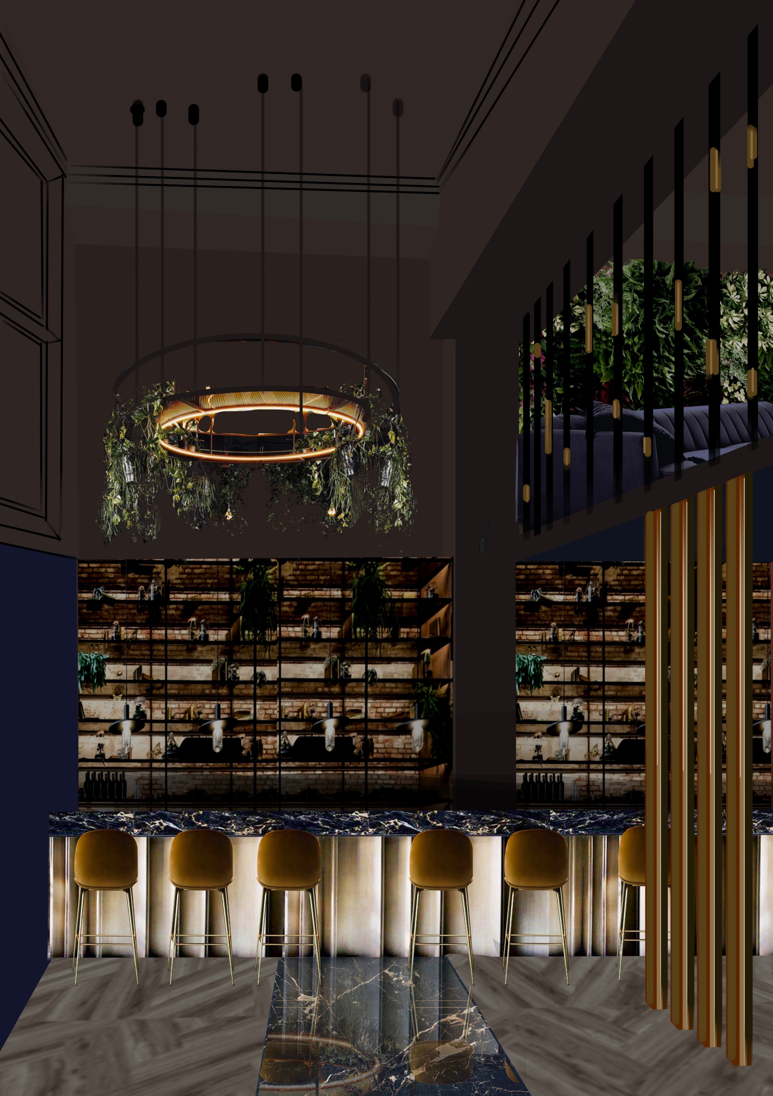 Быстрый проект - быстрая реализация. Интерьер в стиле лофт. Добавили чёрный мрамор с золотыми прожилками Мебель с золотым каркасом Кессоны на стене Широкий классический карниз на потолке Смягчили большим количеством зелени Изюминка в центре - стеклянный винный шкаф с подсветкой высотой 5 метров Получилось очень дорого и красиво!