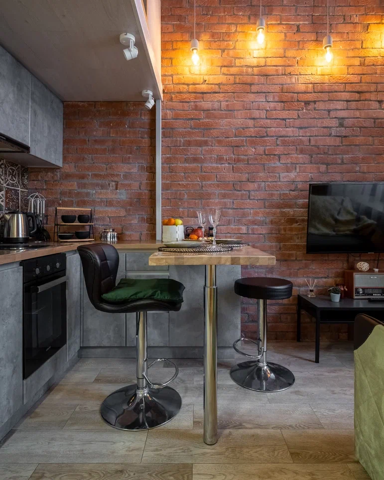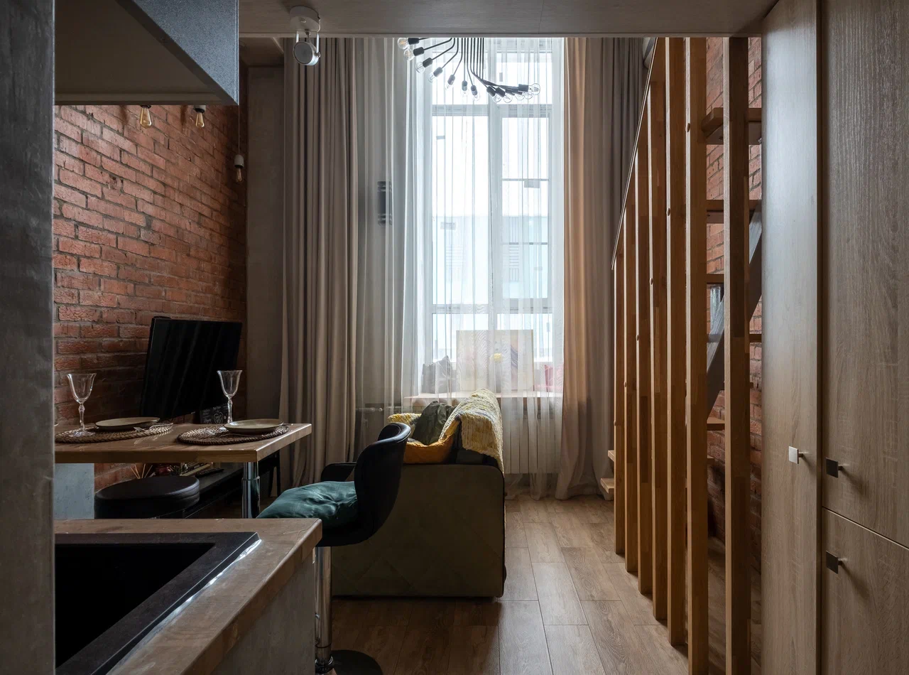 Интерьеры под сдачу в аренду – это отдельная категория в дизайне, но при этом не менее интересная. Здесь важно мыслить более масштабно и стараться угадать, что понравится большому количеству людей. Потому что за-ранее дизайнеру, как и заказчику неизвестно, кто будет проживать в квартире. Безусловно, есть ориентир на количество человек и возможный пол, но интересы и вкусовые качества остаются под вопросом. Под сдачу выполняется универсальный проект, в этом и заключается специфика работы направления. Небольшое помещение, площадью около 30м2 (учитывая второй уровень), сделано в стиле лофт. Стены изначально были кирпичными и мы их решили сохранить. Они идеально вписались в нашу стилистику. Кирпич — это именно та деталь помещения, которая зацепила заказчика при покупке апартаментов. А так же задала общее настроение интерьера помещения. На первом уровне расположена кухня, гостиная и санузел, на втором – спальная зона. Мы использовали разные сценарии освещения для этого проекта. Основным, является люстра необычной формы, выполненная из металла. Над кухонной зоной и гостиной, мы добавили споты с направленным освещением, как дополнительный свет. По двум сторонам от окна, разбавили интерьер необычными бра в виде огнетушителей. На мой взгляд они идеально здесь подходят. Вернёмся к главной детали лофта – кирпичной кладке. Его зачищали от арматуры, от кладочного материала-цемента и покрывали прозрачным лаком. Мебель мы использовали достаточно простую, кухню и прихожую сделали под дерево, а мягкую мебель подобрали в сером цвете. Санузел, в этих апартаментах очень маленького размера. Но тем не менее, мы смогли разместить все необходимое на небольшой площади: душевую кабину, инсталляцию, раковину и под ней стиральную машину. Душевую мы сделали со специальным трапом, в обычных квартирах такой прием делать незаконно, но так как у нас апартаменты, да еще на первом этаже все получилось по правилам! Плитку мы подобрали в двух рисунках — керамогранит под бетон и в стиле пэчворк. Эта квартира получилась очень уютной и стильной. А мое видение, универсального пространства, уверена совпадает с большинством.