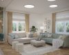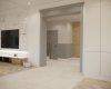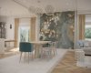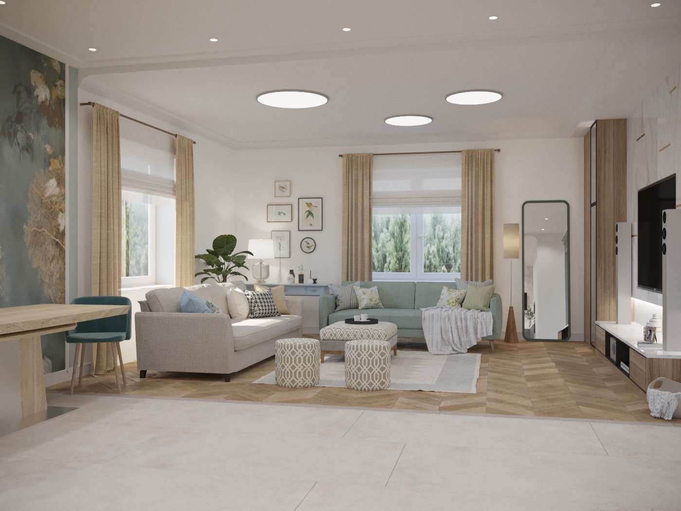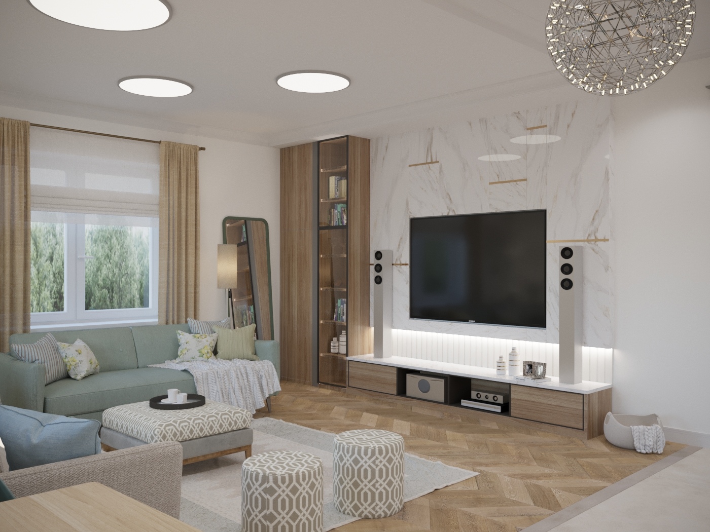 В другой части организовалась комфортная зона гостиной с домашним кинотеатром. Диваны и пуфы размещены буквой П, что располагает к теплой беседе и уютному просмотру кино. Пуфы свободно передвигаются и делают пространство еще более свободным. Зона ТВ оформлена керамогранитом под мрамор, что перекликается с кухней. Рядом выделен вместительный шкаф для книг. Обилие окон наполняет пространство светом, теплом, воздушностью. Это поддержано и в отделке: светлая покраска стен, натуральные оттенки дерева пола и мебели, светлый потолок с лаконичными карнизами. Центральное место в комнате занимает фреска с элементами барельефа глубоких зеленых оттенков. Она встречает нас из холла, придает торжественность помещению, разделяет зону кухни и гостиной.