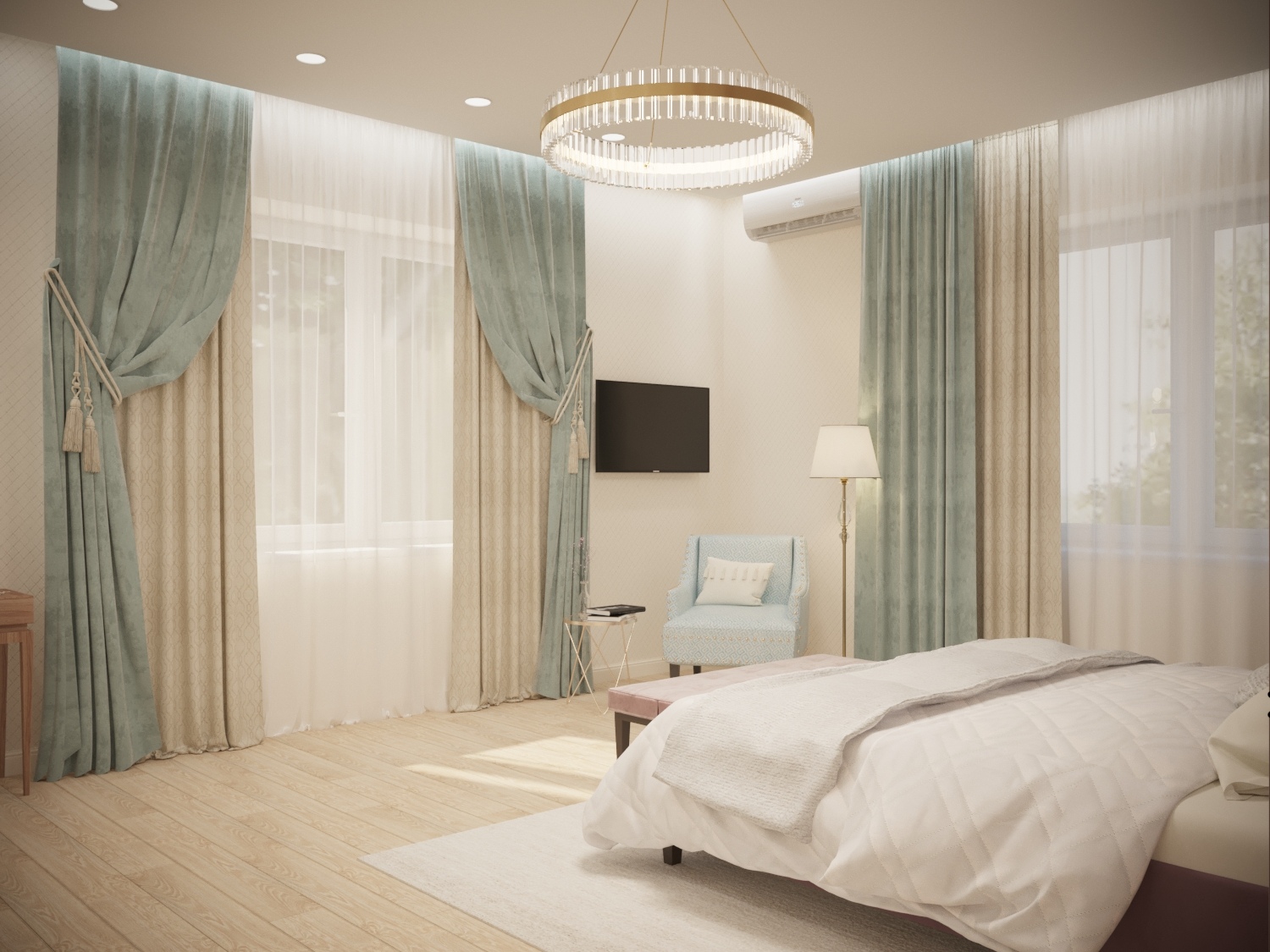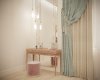 В спальне хозяев выделена отдельная гардеробная комната, но заметить вход в нее будет не так просто. Она располагается за стеной изголовья кровати, которое оформляется мебельными шкафами, за одной дверкой как раз и скрывается вход. В комнате на разных стенах есть два больших окна, наполняющие спальню светом и утренними рассветами. Около изголовья расположились мебельные ниши и бра для чтения. Выделена будуарная зона для хозяйки дома и вместительный комод. Оформление спальни в контрастных оттенках бежевого, пыльно голубого и сиренево-розового. Фреска в изголовье поддерживается текстилем и элементами мебели. В спальне продумано несколько сценариев освещения на разных уровнях: подсветка по периметру потолка, люстра с точками, лампы, торшер, бра. Это позволит создавать неповторимую атмосферу каждый день.