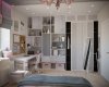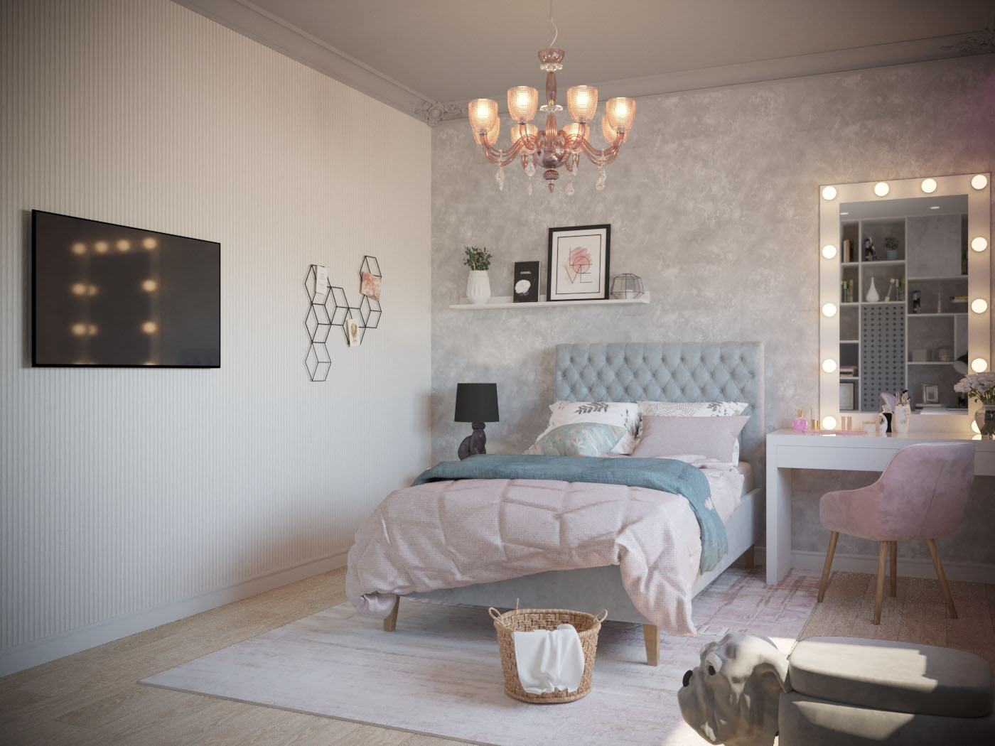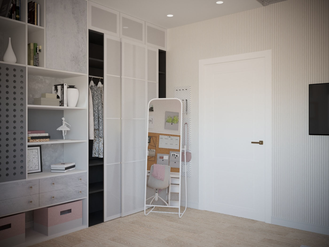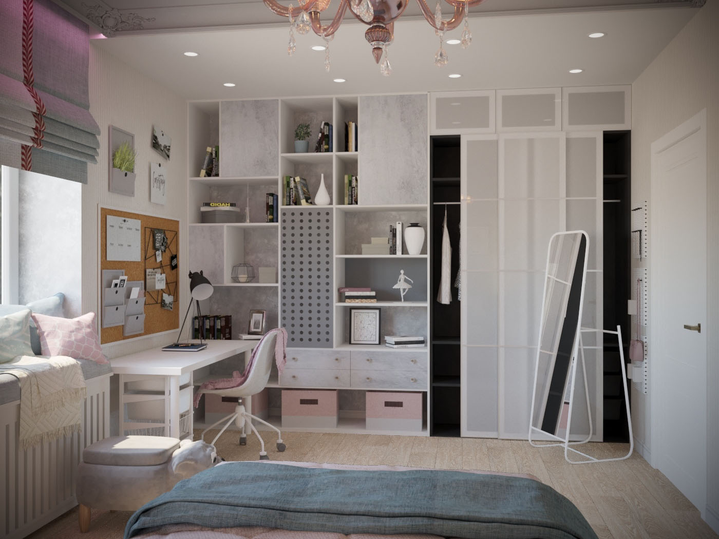 Детские комнаты проектировались с учетом возраста, увлечений и характера детей. Комната для старшей дочки- подростка оформлена в светлых, нежных оттенках. Она увлекается творчеством, рисованием, пением, танцами и заполнит комнату яркими элементами. Особым пожеланием было разместить в комнате макияжный столик с зеркалом с лампочками и мягкую зону на окне. Выделены спальная и рабочая зоны. Одну стену занимает стеллаж и шкаф для одежды. Предусмотрено место для напольного зеркала, крючки для украшений, сумок. Над рабочим столом разместилась пробковая доска для различных заметок, рисунков, коллажей. Изысканность комнате придает потолок в спальной зоне, он выделен серым цветом и ажурной лепниной. В нише для штор заложена подсветка, меняющая цвета.