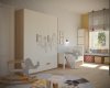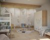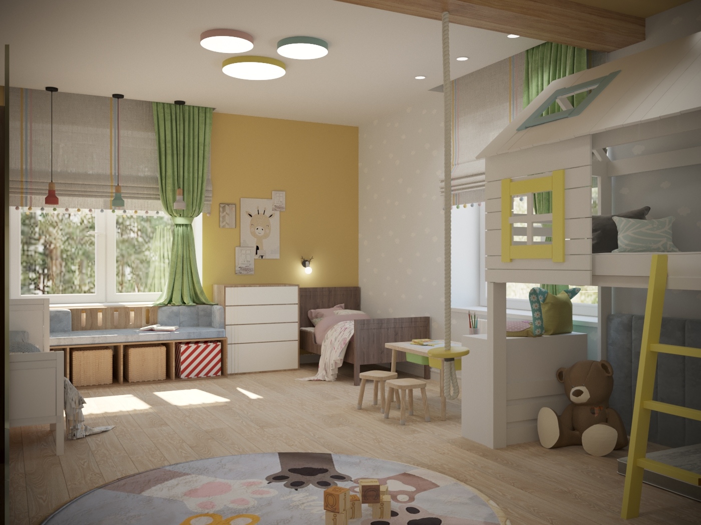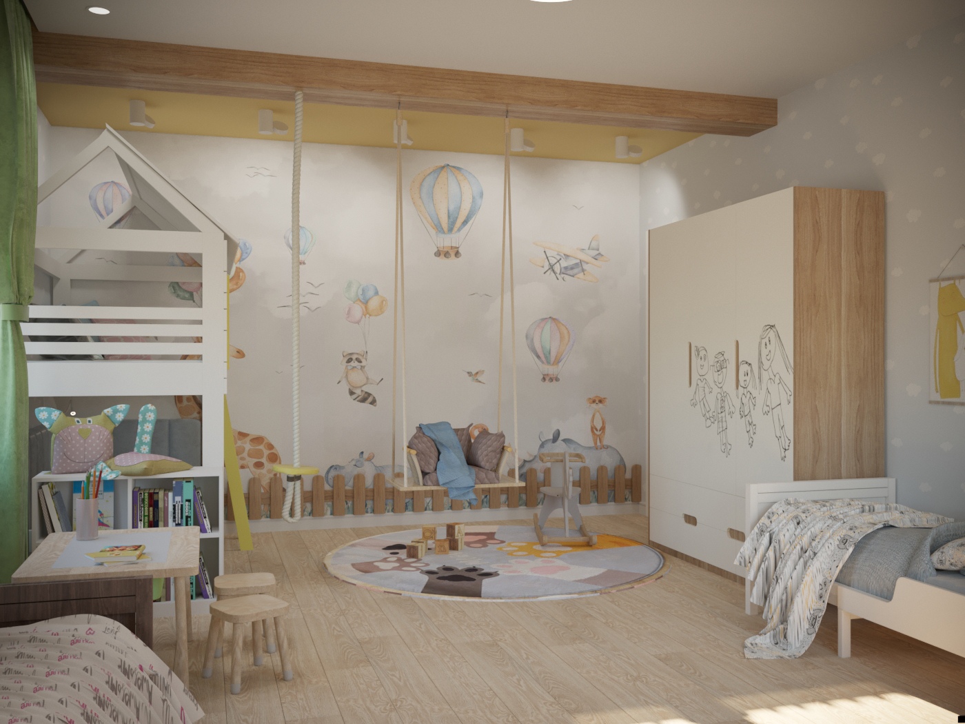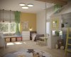 Во второй детской создано пространство для двух малышей: мальчика и девочки. Спальные места разделены. Выделена большая игровая зона. На потолке крепится балка для качелей, каната. Напротив, входа – игровой домик-чердак. На фасадах вместительного шкафа для одежды можно рисовать маркерами и потом стирать. Около одного окна разместился стол для занятий, лепки, рисования. Вдоль второго окна организовался диванчик с хранением игрушек, стеллаж и комод. Диванчик расположен между двумя кроватями, и вечером родители будут приходить и читать сказки. В оформлении детской комнаты использовались натуральные оттенки дерева, яркая покраска и яркие элементы в текстиле и мебели. В игровой зоне всю стену занимает фреска с изображением животных. Облака на фреске и обоях растворяют границы комнаты, позволяя фантазии уноситься в фантастичные миры.