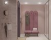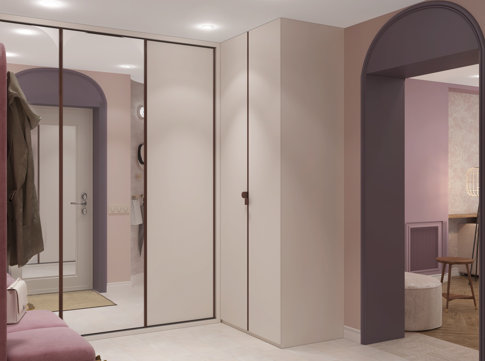 Банкетка с мягкой высокой арочной спинкой встречает при входе, а вместительный шкаф, служит гардеробом для домочадцев. При переходе из прихожей в гостиную справа в нише предусмотрены крючки для хранения сумок, шарфов и головных уборов. Такая система удобна для быстрого доступа к основным аксессуарам необходимым в тот или иной сезон.