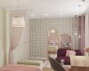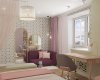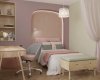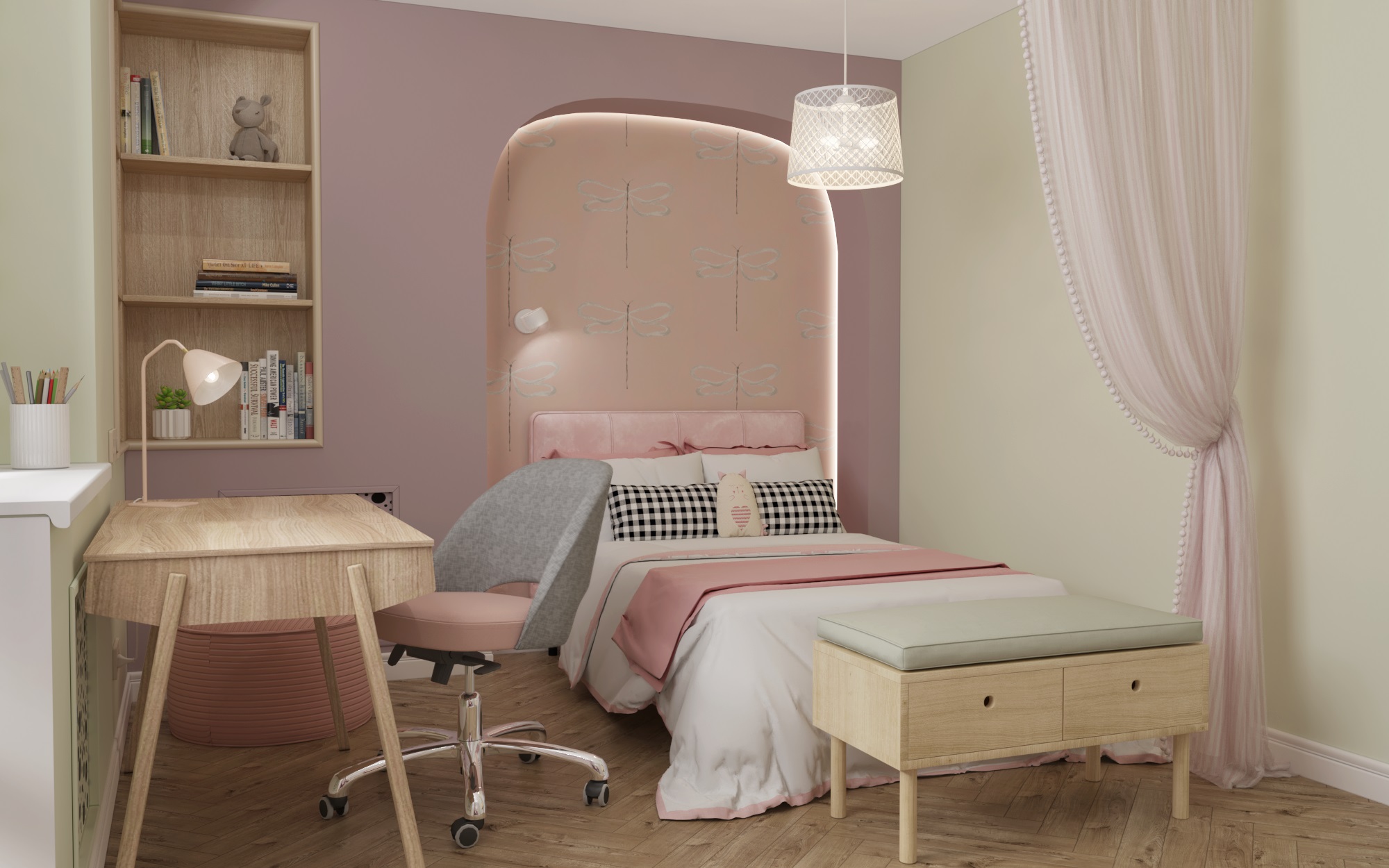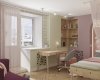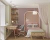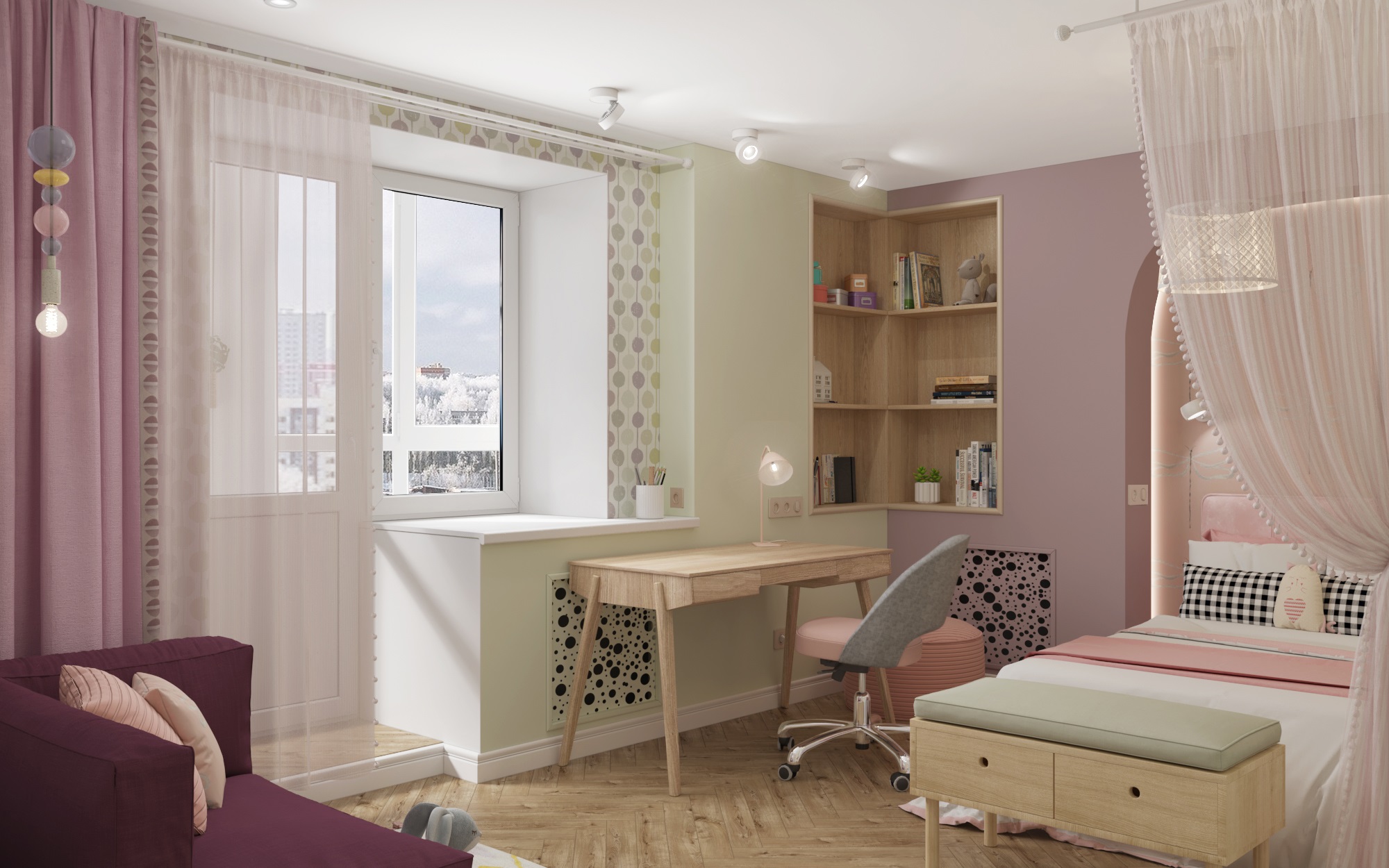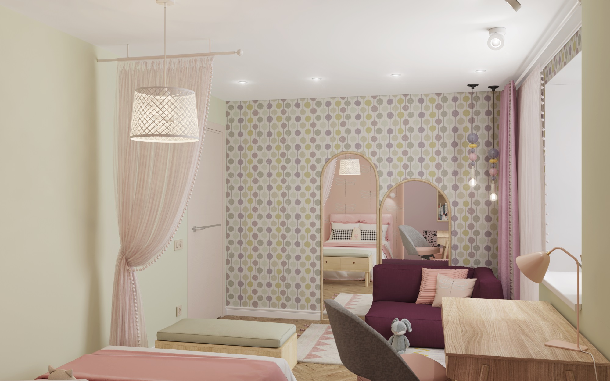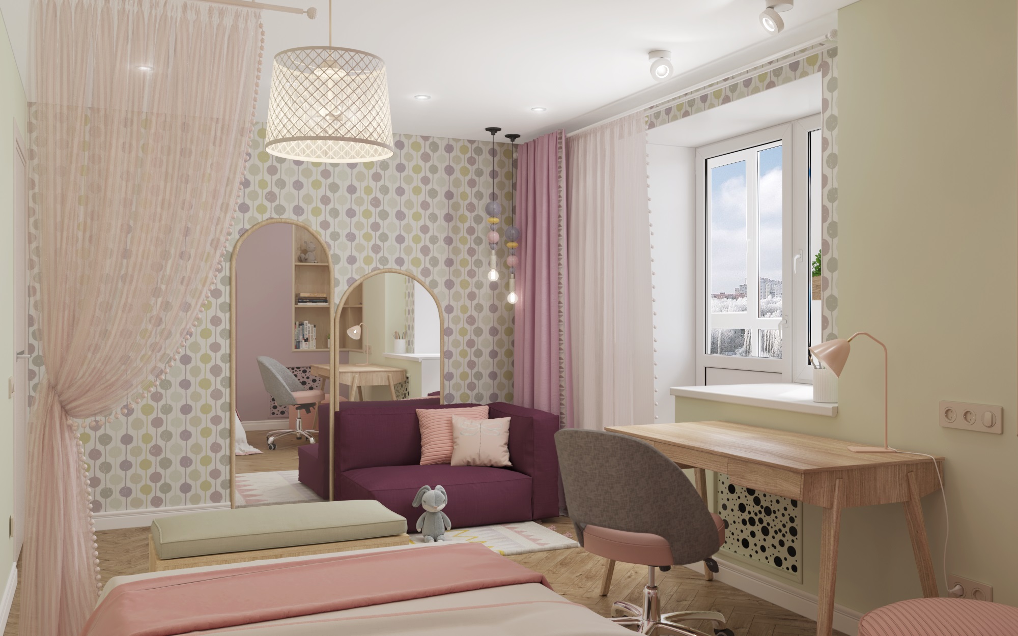 Комната разработана для девочки-подростка. Оформление стен детской комнаты, это продолжение идеи использования ниши с арочным сводом. В детской продуманы несколько уютных зон, где ребенок может спрятаться и побыть один, поразмышлять и помечтать: уютная зона с кроватью за прозрачной шторой, мягкая зона с пуфом-диваном, а также зона с учебным столом. Отделка стен более яркая и сочная, использованы два вида декоративных обоев с романтичными принтами, а также зеленые оттенки в стенах, мебели и декоре, которые добавляют свежести и легкости интерьеру.