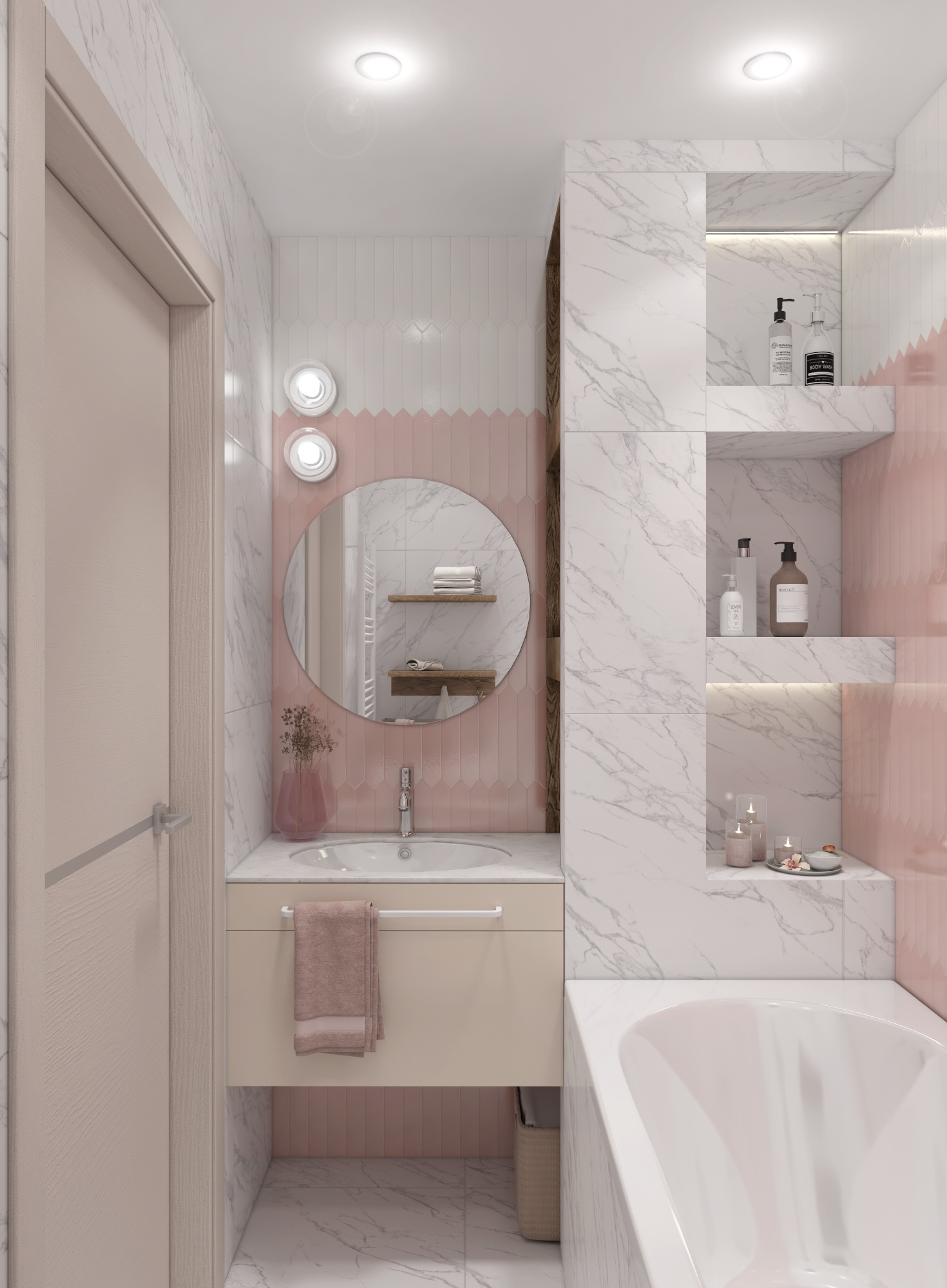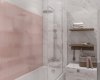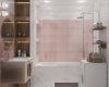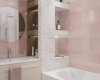 Ванная выдержана в нежных и светлых тонах белой, розовой плитки. Создание короба с нишами для полок позволило функционально разделить комнату на зоны: принятия ванны и умывания. Также в ванной удалось удобно разместить стиральную машинку.