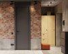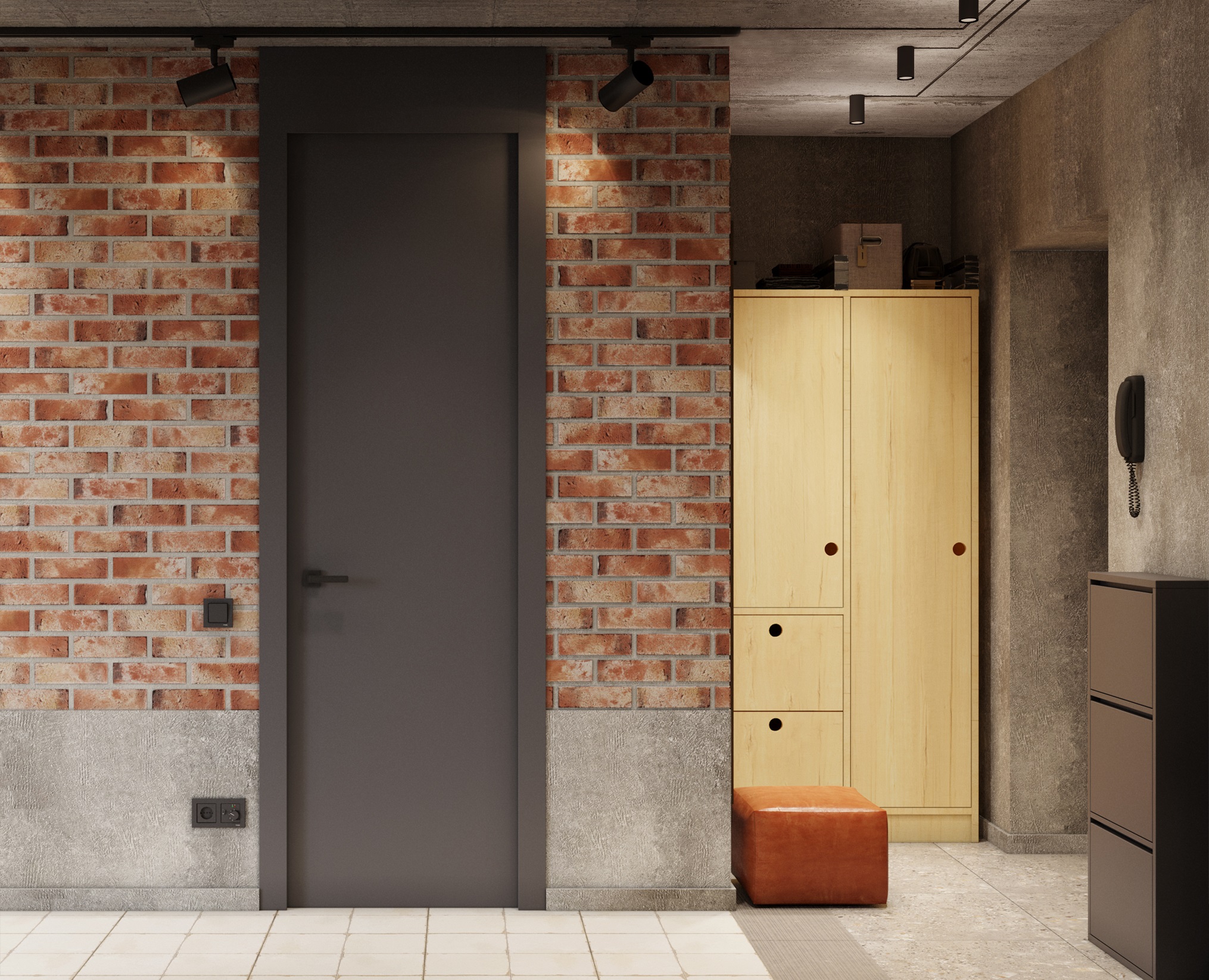 Панорамное остекление квартиры, обрамленное в откосы черного цвета, добавляет преимущества квартире, усиливает контраст с основной отделкой квартиры декоративным кирпичом и тем самым создается ощущение «петербуржской квартиры». Трековое освещение на черновом бетонном потолке подчеркивает стиль. Для дополнительной подсветки были добавлены настенные бра, а также декоративный светильник на стене в коридоре. Квартира изначально требовала перепланировки, т.к пожелание заказчика было объединить помещения гостиной и кухни и выделить отдельное помещение для спальни. В ходе разработки планировочного решения нам удалось выделить отдельную спальню с зоной открытого гардероба и получить большое помещение прямоугольной формы кухни-гостиной с панорамными окнами и выходом на лоджию.